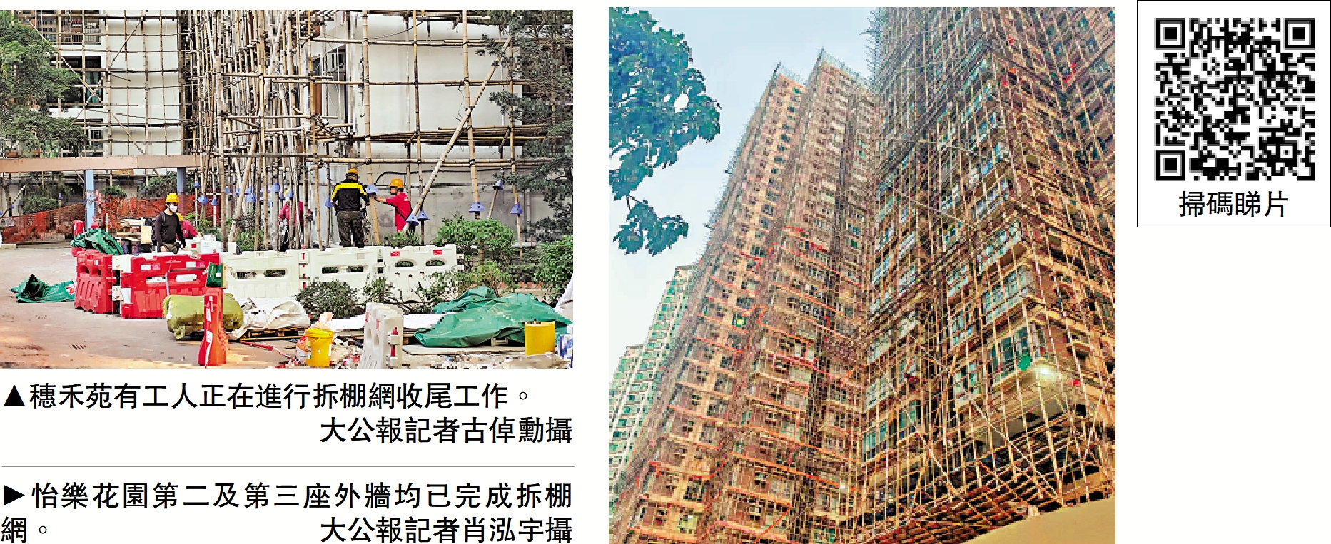 早前表示未必趕及在限期內拆棚網的沙田穗禾苑,大公報記者昨日在現場所見,大部分棚網於下午已完成清拆,多名工人在棚架上趕工。穗禾苑的管理公司其後表示,所有棚網已完成清拆。
