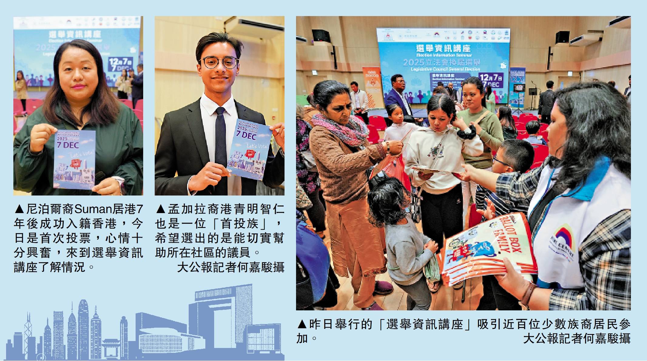 新家園協會昨日聯同20個少數族裔社區組織及油尖旺民政事務處舉辦「選舉資訊講座」。印度協會香港主席毛漢(Mohan Chugani)表示,少數族裔人口已是香港社會重要的組成部分,也應負起責任踴躍去投票。