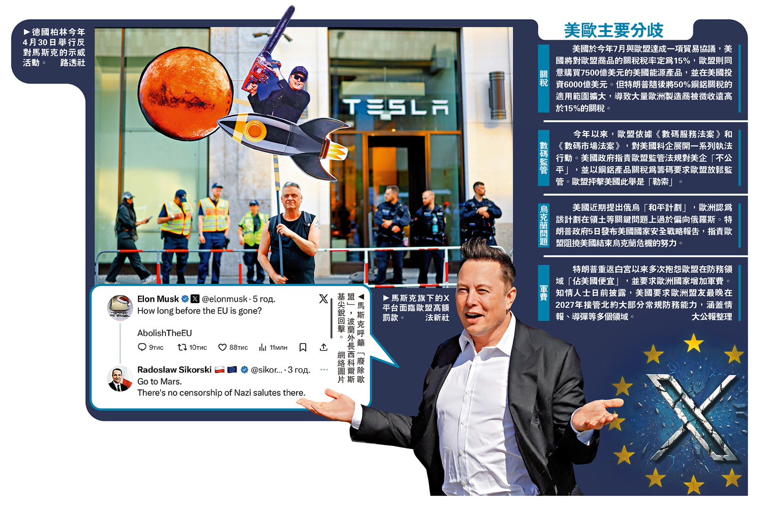 美國億萬富豪馬斯克6日猛烈抨擊歐盟對其社交平台X處以1.2億歐元罰款(約10.88億港元)的決定,並呼籲「廢除歐盟」。美國政府多名高官亦加入抨擊歐盟的行列。波蘭外長西科爾斯基對馬斯克的言論予以尖銳回擊,諷刺他應該「去火星」。美國總統特朗普重返白宮後,美歐在關稅、數碼監管、防務等領域矛盾不斷升級,馬斯克被罰款一事再次凸顯美歐分歧。