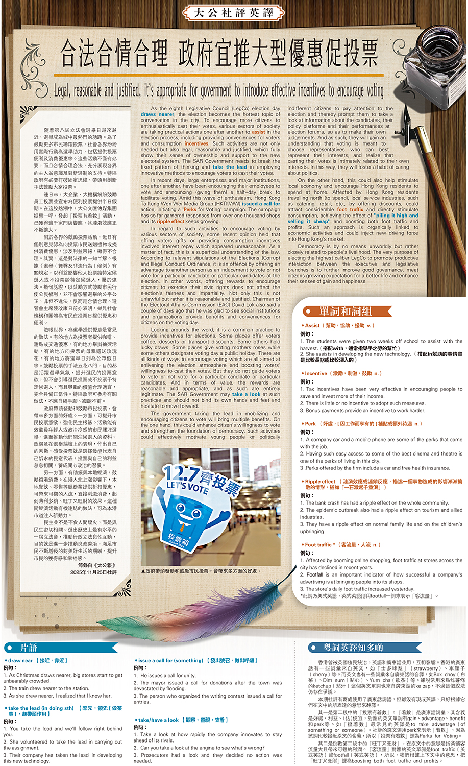 Looking arounds the word, it is a common practice to provide incentives for elections. Some places offer voters coffee, desserts or transport discounts. Some others hold lucky draws. Some places give voting mothers roses while some others designate voting day a public holiday. There are all kinds of ways to encourage voting which are all aimed at enlivening the election atmosphere and boosting voters' willingness to cast their votes. But they do not guide voters to vote or not vote for a particular candidate or particular candidates. And in terms of value, the rewards are reasonable and appropriate, and as such are entirely legitimate. The SAR Government may take a look at such practices and should not bind its own hands and feet and hesitate to move forward.