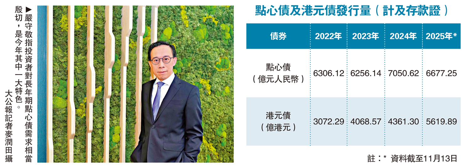 據彭博統計,由年初至今(資料截至今年11月13日),點心債(計及存款證)發行量約為6677.25億元(人民幣,下同),較2024年同期(約5906.88億元)增加13%。渣打銀行大中華及北亞地區資本市場主管嚴守敬接受《大公報》訪問時表示,點心債發行量在今年第一季時仍然疲弱,約1183.48億元,按年仍跌近21%,主要受中美經貿關係緊張拖累。