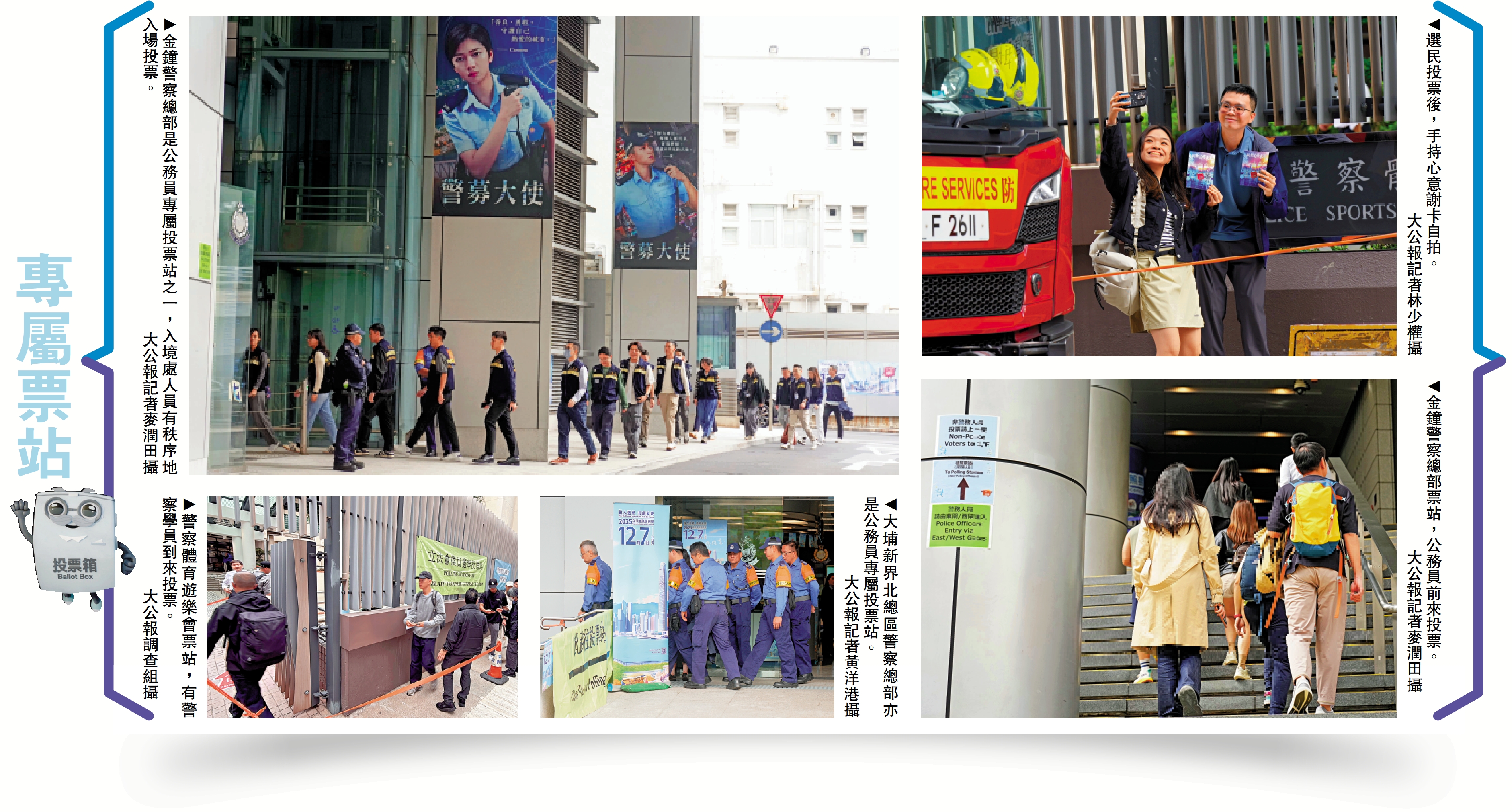 大公報記者昨日分別到設於新界北總區警察總部、警察體育遊樂會、水警港外區總部等公務員專屬票站觀察,現場十分熱鬧,不斷有警務人員前來投票,亦有巴士接送懲教署、入境處等不同紀律部隊人員來到現場。