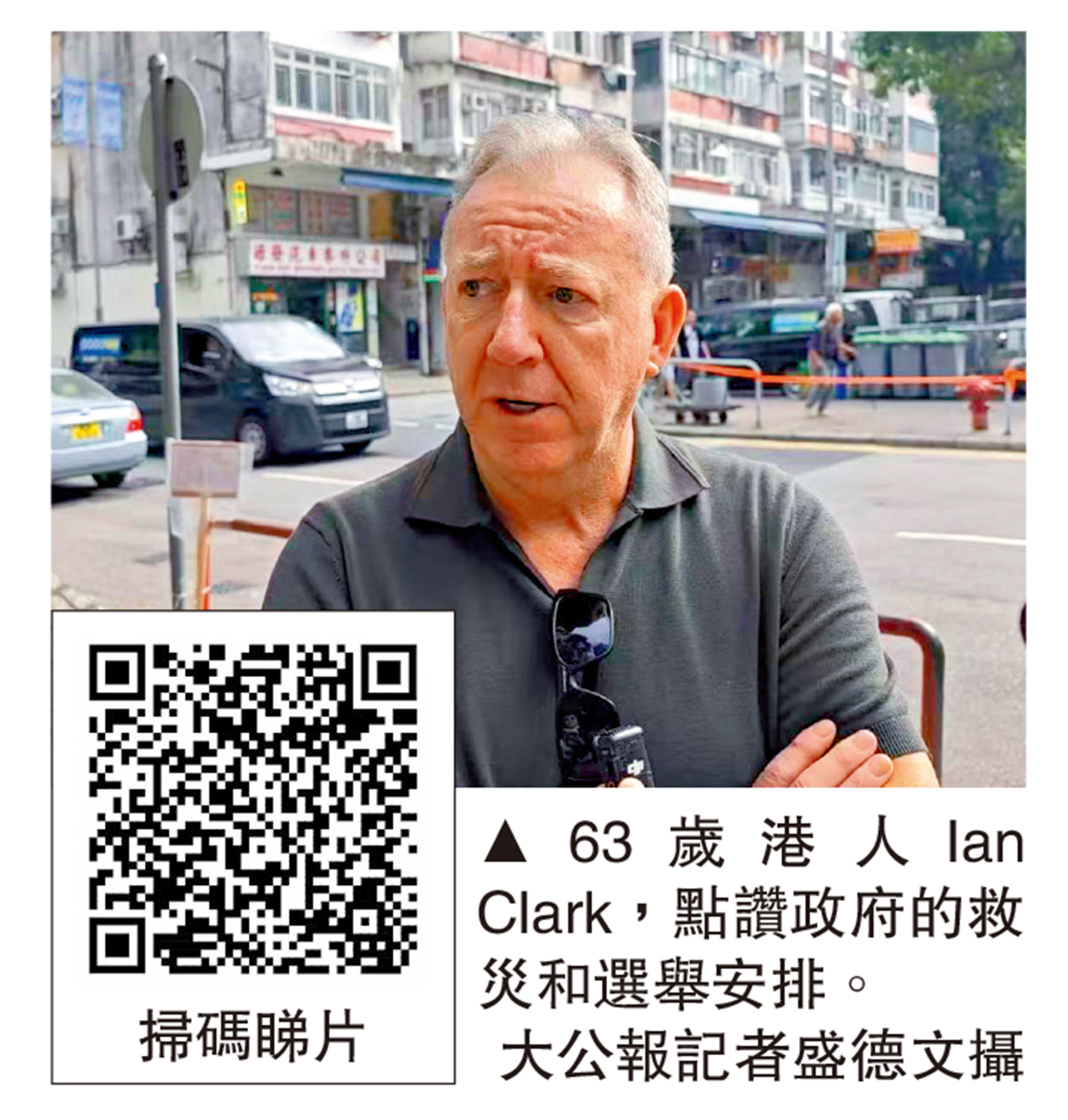 63歲港人伊恩·克拉克(Ian Clark),盛讚政府的救災和選舉安排。出生於蘇格蘭的克拉克在票站外對大公報記者表示,與妻子和三個孩子在香港生活了30多年,3個兒子均在港出生,早已視香港為家,對身為香港人深感自豪。他表示,自己比較關注候選人對於區內情況是否足夠了解,能否滿足居民的實際需求。他高度評價政府今次的救災表現,稱讚警方、消防隊等相關部門和人員已極力做到最好。作為資深選民,他認為投票是每個公民的責任,只有發聲才能推動改變。