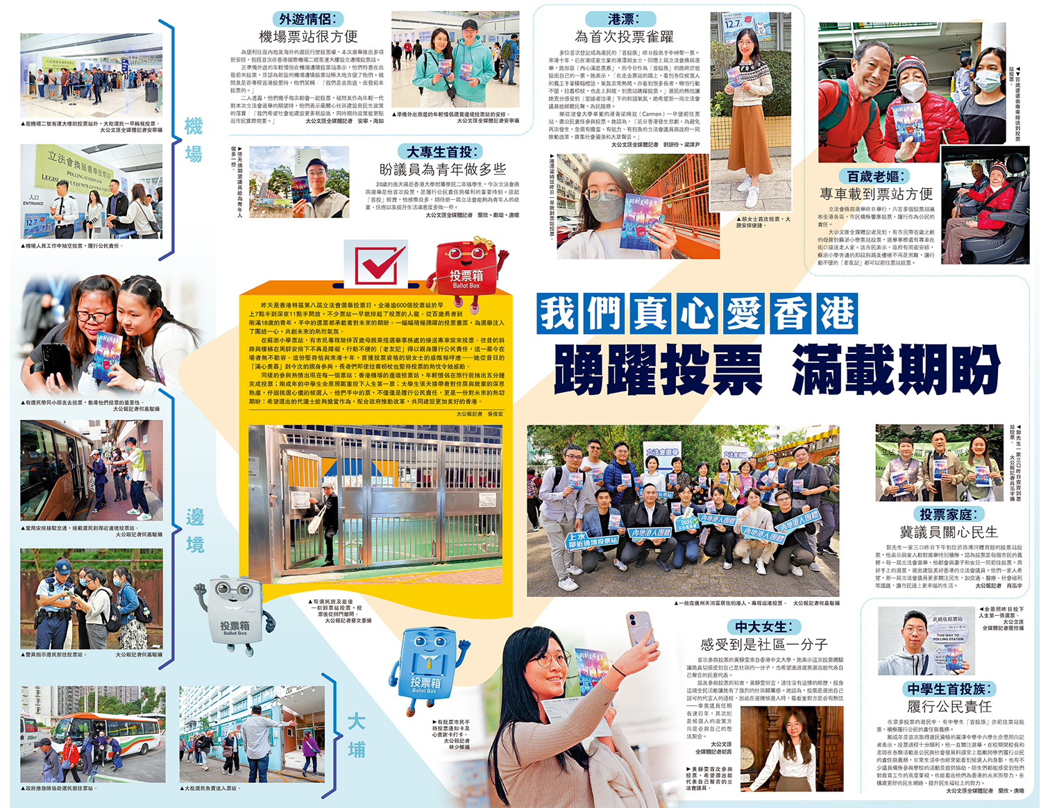 同樣的參與熱情出現在每一個票站:香港機場的邊境投票站,年輕情侶在旅行前抽出五分鐘完成投票;剛成年的中學生余恩照鄭重投下人生第一票;大學生張天揚帶着對住房與就業的深思熟慮,仔細挑選心儀的候選人。他們手中的票,不僅僅是履行公民責任,更是一份對未來的熱切期盼:希望選出的代議士能夠擔當作為,配合政府推動改革,共同建設更加美好的香港。\大公報記者 吳俊宏