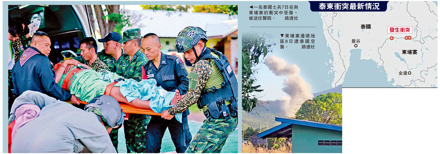 【大公報訊】泰柬兩國連續兩天在邊境交火,雙方各執一詞。泰國陸軍發言人文泰稱,泰軍7日下午在本國境內執行道路修整任務時遭柬軍射擊,2名士兵受傷,泰軍隨後自衛還擊;衝突於8日凌晨升級,柬方使用輕武器、火炮及其他支援武器,導致泰軍人員傷亡。出於自衛,泰方出動空軍F-16戰機,打擊柬埔寨軍事目標。