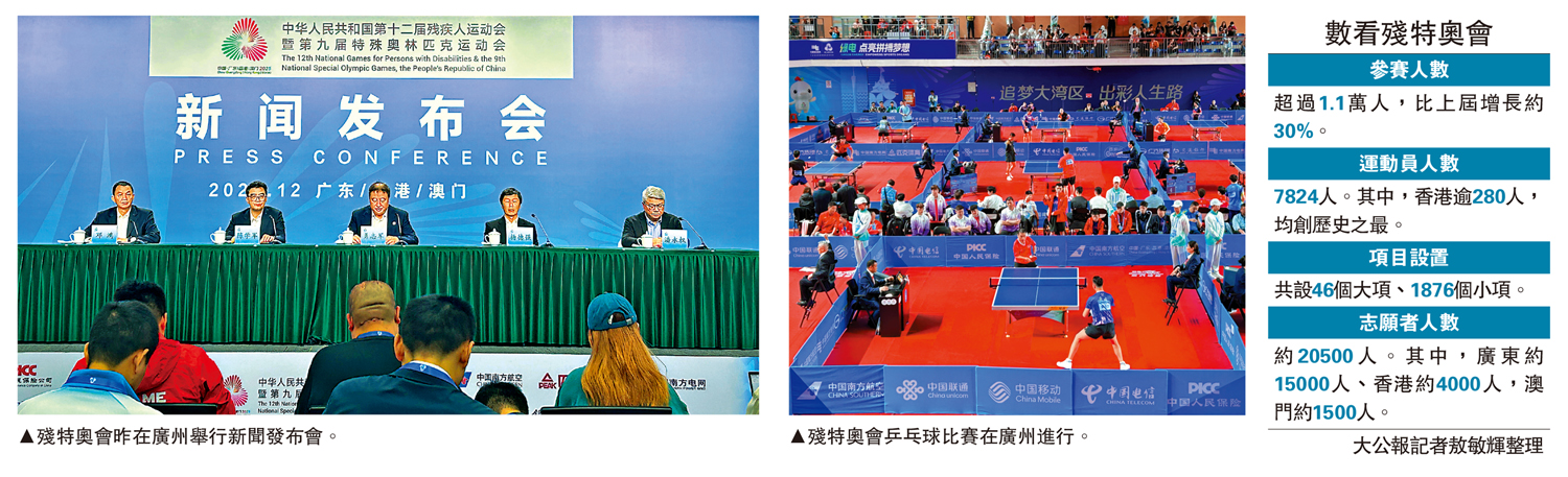 8日,由粵港澳共同承辦的全國第12屆殘疾人運動會暨第9屆特殊奧林匹克運動會正式開幕。本屆殘特奧會共設46個大項、1876個小項,來自全國的34個代表團共7824名運動員參賽。其中,香港派出逾280位運動員,是歷屆殘特奧會參賽規模之最,將出戰14個殘運會競賽項目、4個殘運會大眾項目及7個特奧會項目。\大公報記者 敖敏輝廣州報道(文、圖)