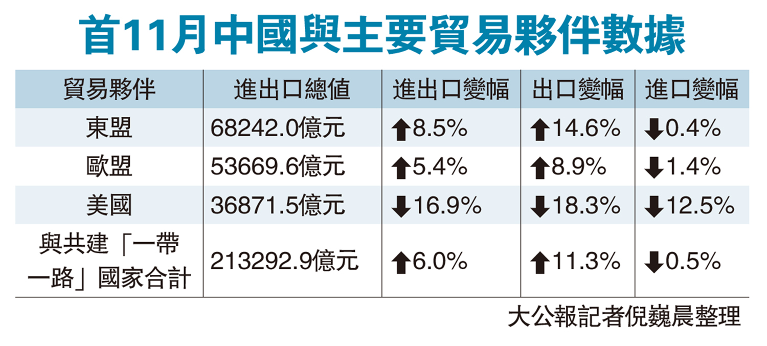 歐盟及美國分別為中國第二及第三大貿易夥伴。前11個月,中歐貿易總值5.37萬億元,同比增長5.4%,佔外貿總值13%;對歐盟出口增長8.9%,自歐盟進口下降1.4%。同期中美貿易總值3.69萬億元,同比下降16.9%,佔比8.9%;對美出口下降18.3%,自美進口下降12.5%。此外,中國與共建「一帶一路」國家合計進出口21.33萬億元,同比增長6%。