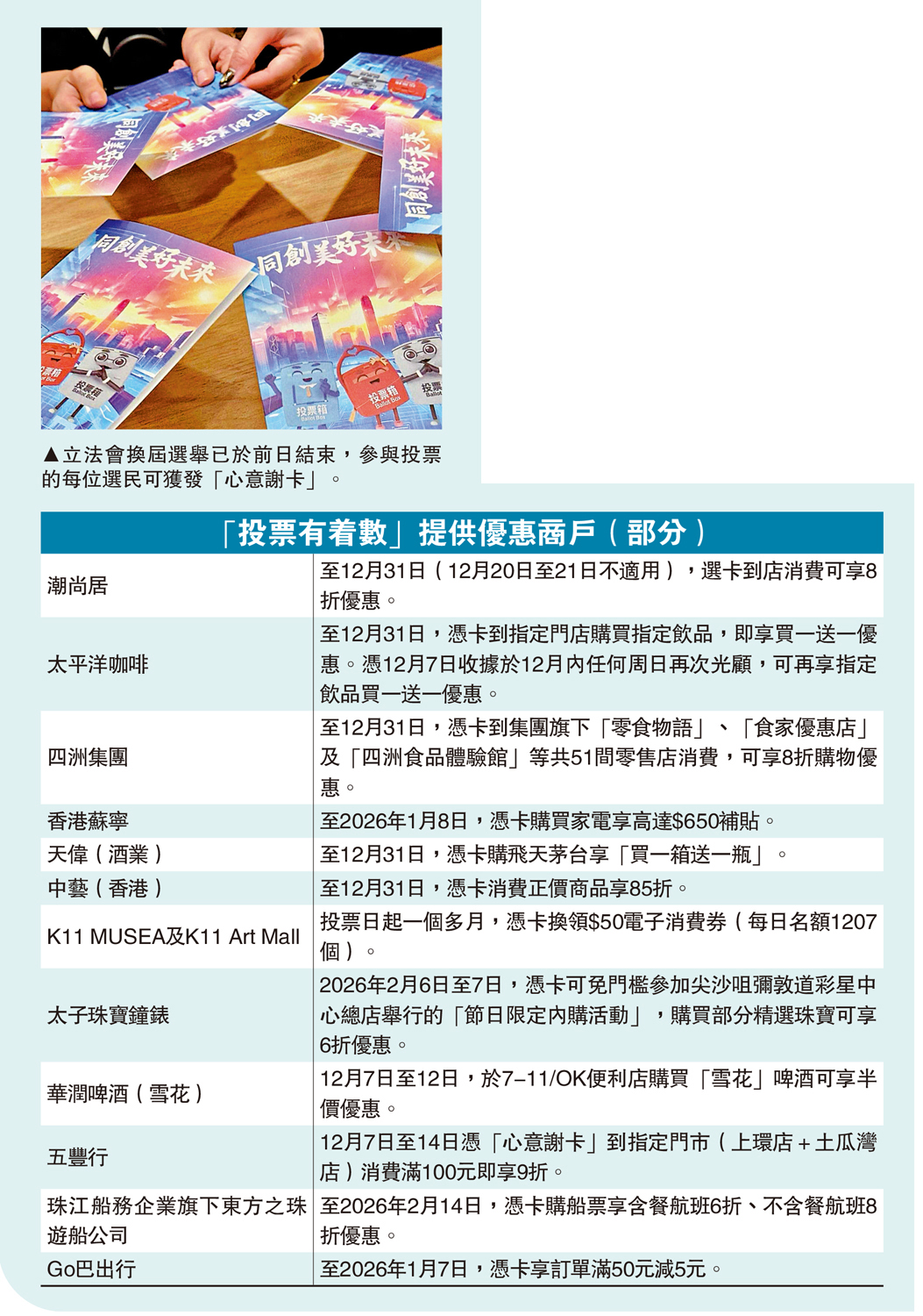 【大公報訊】2025立法會換屆選舉投票已於前日結束,參與投票的每位選民可獲發政府所派的「心意謝卡」一張,憑此卡可參與此前由香港大公文匯傳媒集團獨家發起的「投票有着數」活動,現有超過1800間門店依然在持續提供優惠,覆蓋餐飲、交通、旅遊、零售、美容等領域,部分優惠甚至持續至明年2月。