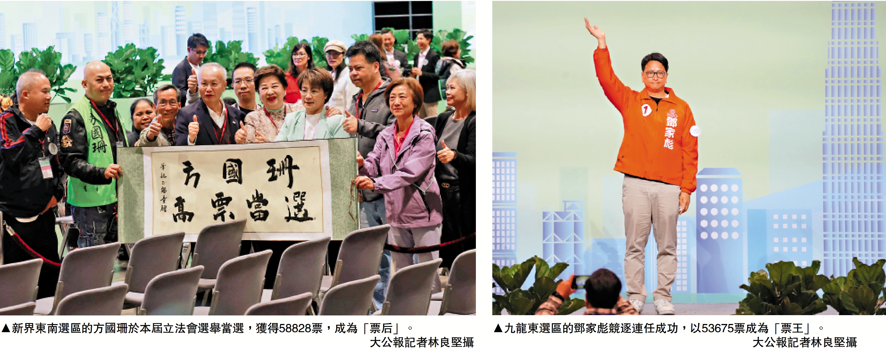 新一屆立法會選舉結果於昨日凌晨陸續出爐,地區直選方面,新界東南選區的方國珊曾五度參與立法會選舉,本屆終於當選並獲得58828票,成為「票后」,她直言「只有累積才有成績」。九龍東選區的鄧家彪以53675票成為「票王」,形容成功來自地區扎根與居民信任。他們均認為,上任後當務之急是協助大埔宏福苑救災善後,跟進災後重建、樓宇維修、消防安全等議題,幫助災民早日重建家園。\大公報記者 義 昊