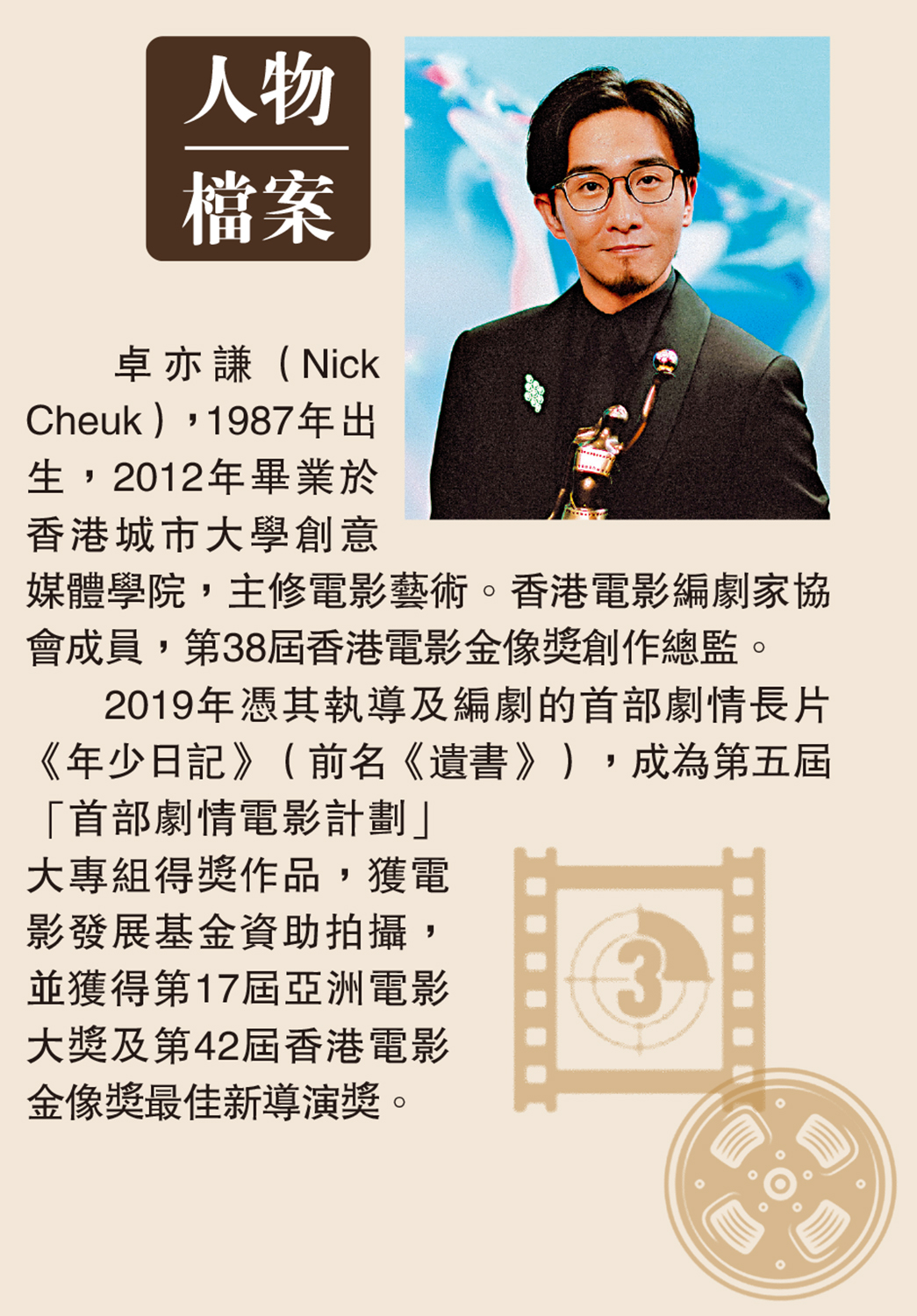 卓亦謙(Nick Cheuk),1987年出生,2012年畢業於香港城市大學創意媒體學院,主修電影藝術。香港電影編劇家協會成員,第38屆香港電影金像獎創作總監。