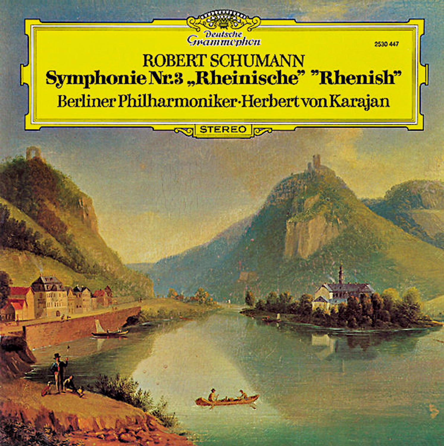 上月底,德國指揮大師蒂勒曼攜手維也納愛樂樂團在國家大劇院為京城古典樂愛好者帶來了兩場視聽盛宴。我買的首場,舒曼《第三號「萊茵河」交響曲》和勃拉姆斯《第四號交響曲》,整場下來耳朵極度舒適,酣暢淋漓。最後,曾共同演繹二○二四年維也納新年音樂會的指揮和樂團還返場了一曲《藍色多瑙河》,真是原汁原味的提前過年。藉着音樂會的餘溫,本周分享一張由德意志留聲機唱片公司於一九七四年灌錄並發行,「指揮帝王」卡拉揚執棒柏林愛樂樂團的舒曼《第三號「萊茵河」交響曲》。專輯封套選擇的是十九世紀德國浪漫主義風景畫家約翰·巴赫塔筆下的萊茵河風光《龍崖、諾能維特島和羅蘭塞克堡拱門》局部。
