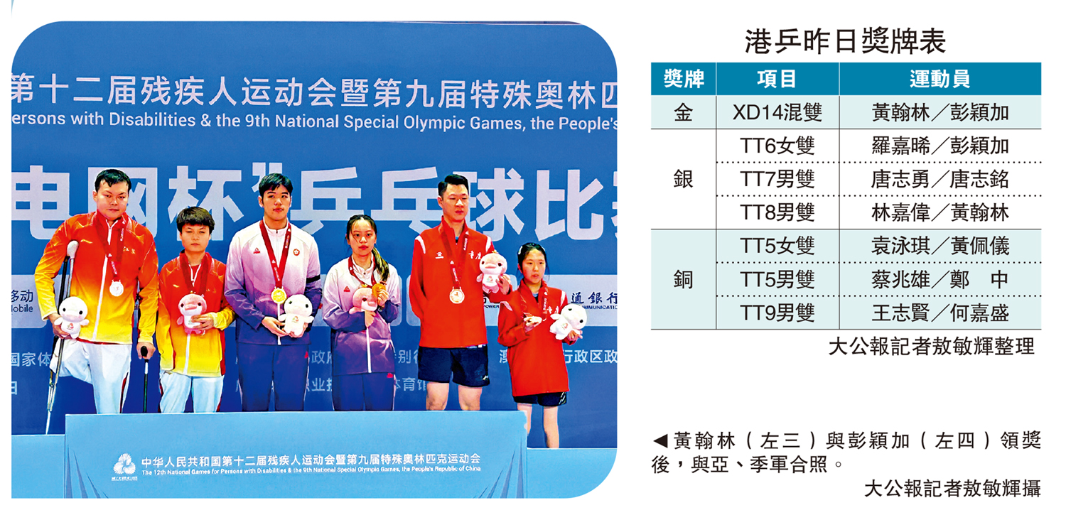 【大公報訊】記者敖敏輝廣州報道:9日,殘特奧會乒乓球比賽迎來第5個比賽日,香港隊迎來獎牌豐收日,單日狂攬7枚獎牌,獎牌總數增至9枚,遠超預期目標。其中,在XD14混合雙打決賽中,港隊組合黃翰林/彭穎加苦戰5局,以3:2戰勝該組別頭號種子江蘇隊組合閆碩/范怡雯,奪得金牌。