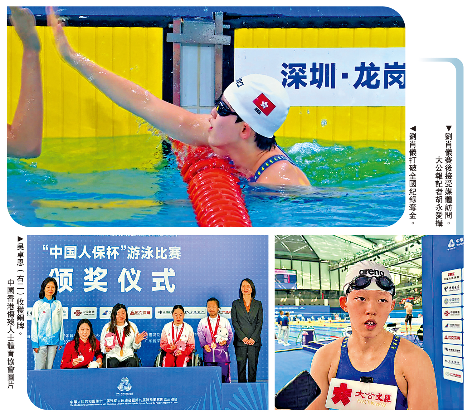 9日,全國第12屆殘疾人運動會暨第9屆特殊奧林匹克運動會游泳項目開賽,香港隊在首日比賽中表演亮眼,上午的女子200米自由泳S14級決賽,劉肖儀、陳睿琳及張可盈3位選手分別取得冠軍、亞軍及殿軍,劉肖儀游出2分13秒50的成績,更打破全國紀錄;「小飛魚」吳卓恩在女子200米個人混合泳SM7級中收穫季軍;張浚諾則以1分57秒97取得男子200米自由泳S14級季軍。\大公報記者 胡永愛、李薇、石華深圳報道