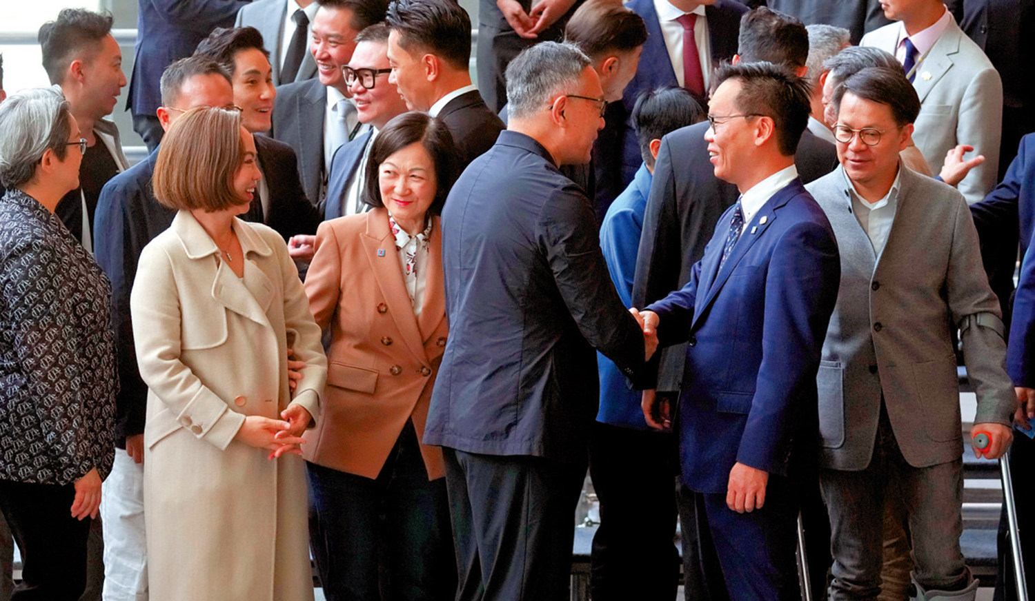 一眾現任、候任議員齊聚立法會拍攝大合照。在會面結束後,現任和候任議員三五成群握手交談,亦有新舊兩屆,來自不同界別的議員合影留念,盡顯薪火相傳和各界別議員精誠合作的精神。\大公報記者 龔學鳴