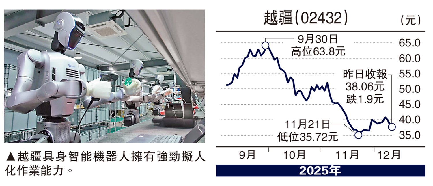人形機器人成功產業化,前景備受市場看好,相關板塊翹楚之一越疆(02432),雖然業績處於虧損狀態,仍不乏資金追捧,上月初的配股行動卻加劇股價波動,近日跌穿40元,不妨考慮趁低吸納,起碼比配股價46.8元低一大截。