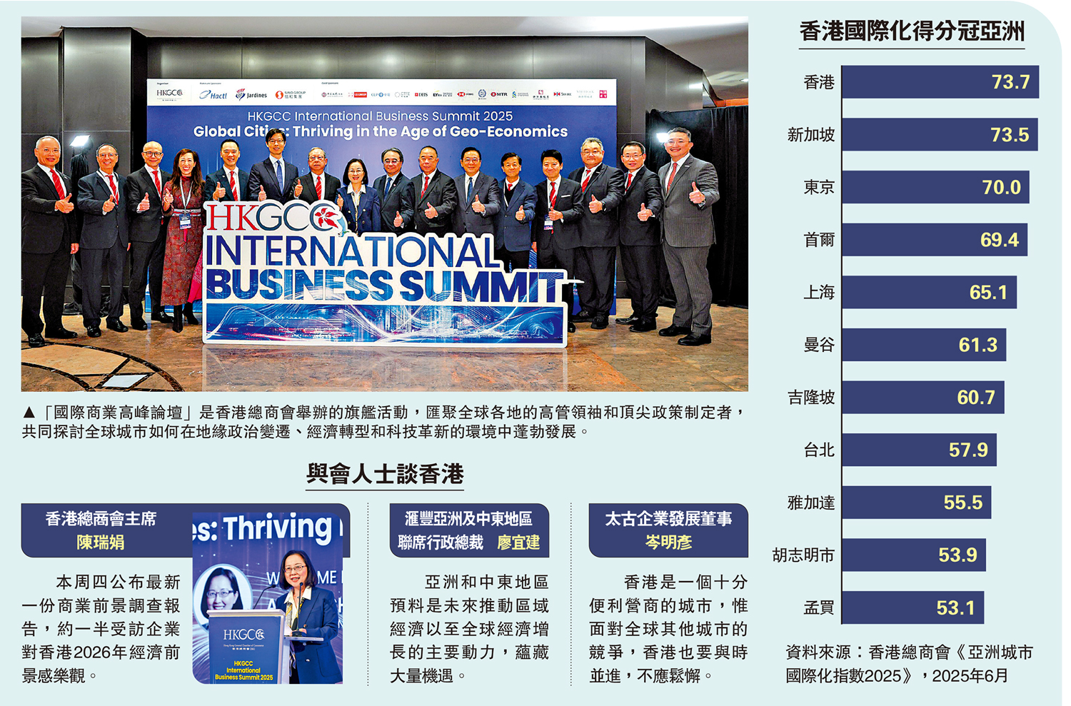 今年的論壇主題是「全球城市:如何在地緣經濟新格局中領航」。雖然香港近年面對不少挑戰,陳瑞娟引述統計數字表示,今年在香港成立的公司數目創新高,香港在多個國際排名上也位於前列位置(見圖),正好應驗「有危便有機」這句諺語。
