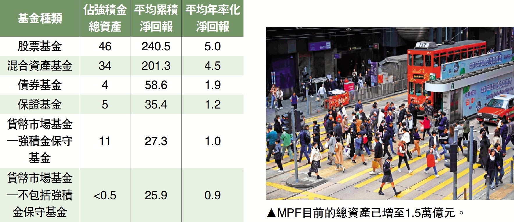 【大公報訊】積金局主席劉麥嘉軒昨日發表網誌,表示12月1日是強積金(MPF)制度實施第25年,有賴僱主和打工仔女的共同努力,MPF的總資產已增至1.5萬億元,2025年初至今的淨投資回報率約15%。自MPF實施以來截至今年10月底,各類基金的年率化投資表現均錄得正回報,而佔MPF總資產合共八成的股票基金和混合資產基金,更分別平均錄得240%及200%累積淨回報,或5%及4.5%年率化淨回報,跑贏同期1.8%年率化通脹。