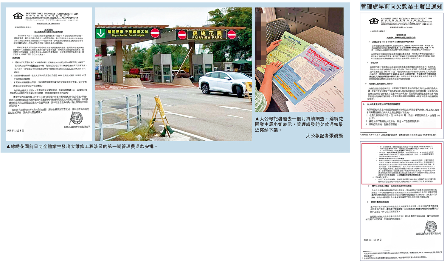 【大公報訊】記者張真報道:大埔宏福苑五級大火後,令屋苑維修工程備受社會關注。元朗錦綉花園早前爆出索價近5億元的「天價」食水管維修工程,引起業主不滿。大公報記者過去一個月持續調查了解,訪問相關人士。前日(8日)物業管理公司終於發出公告,指「目前並不具備推動大維修工程的社區共識與社會條件」,為免引發不必要的爭議,宣布終止集資計劃,將向3000名業主退款。