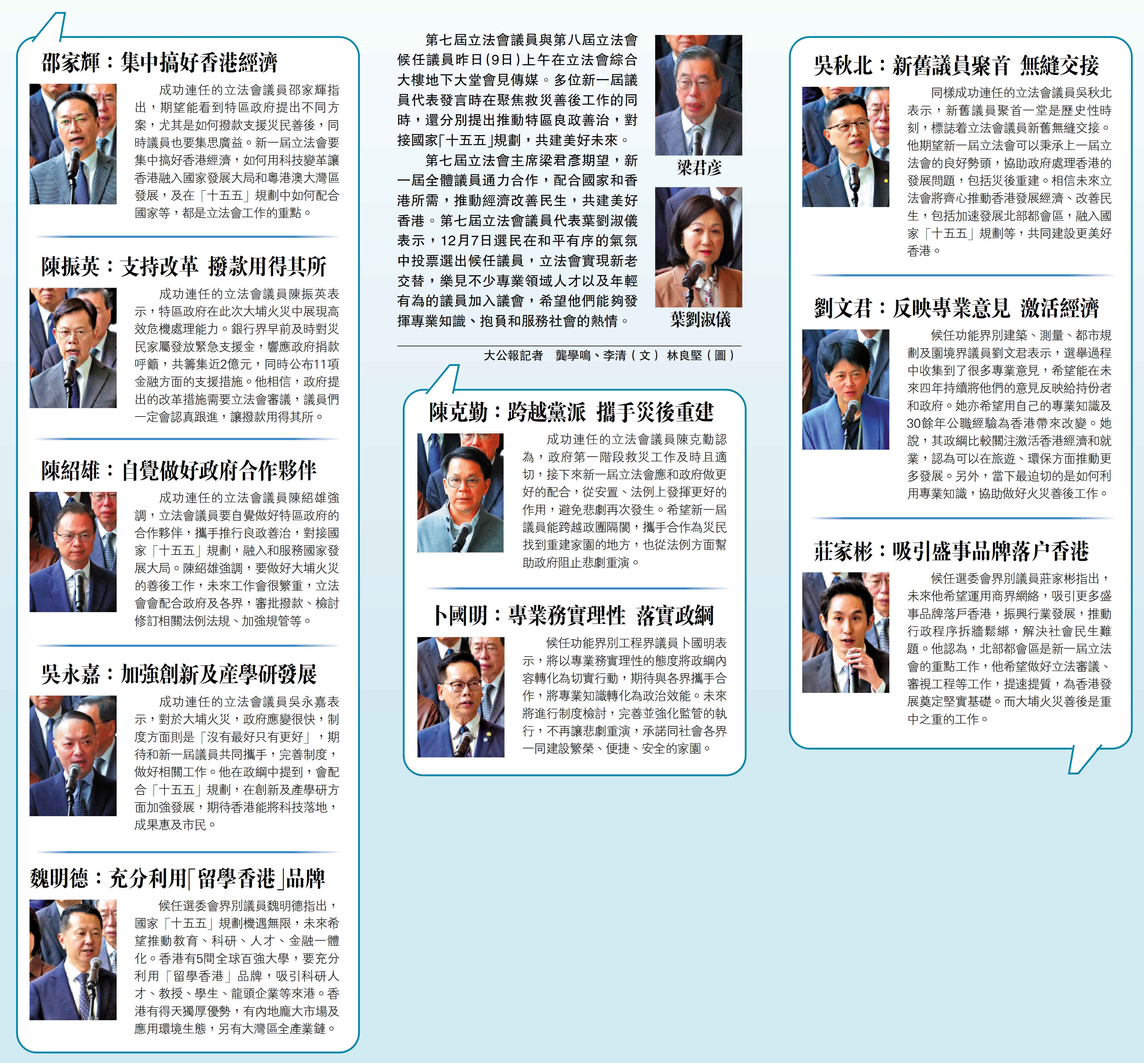 第七屆立法會議員與第八屆立法會候任議員昨日(9日)上午在立法會綜合大樓地下大堂會見傳媒。多位新一屆議員代表發言時在聚焦救災善後工作的同時,還分別提出推動特區良政善治,對接國家「十五五」規劃,共建美好未來。