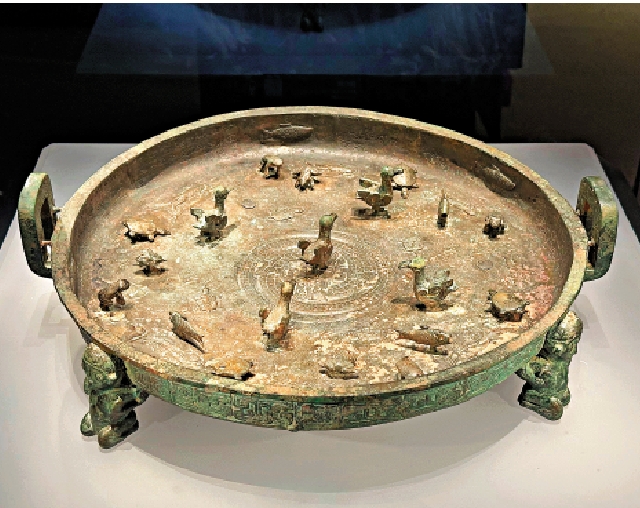 晉公盤屬國家一級文物,原是盥洗用盤。靜置時猶如一座精緻的微縮園林:盤底中央雙龍盤繞,四周環繞着魚、龜、水鳥的浮雕。最奇妙的是,盤內錯落分布着十九隻立體小動物——水鳥、游魚、青蛙、烏龜——皆可三百六十度自由旋轉,鳥嘴能開合,鰲頭可伸縮。當清水注入,水流推動之下,眾生靈彷彿瞬間「活」了起來:鳥喙張合如鳴,魚龜嬉戲其間,頃刻生機盎然。這份巧思與樂趣,是晉文公送給遠嫁女兒的一份獨特安慰——願這方活潑的小天地,能稍解她異鄉的思念。