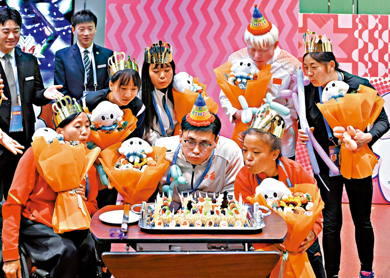 【大公報訊】據中新社報道:殘特奧會田徑項目運動員接待酒店──廣州白雲國際會議中心10日晚舉行集體生日會,多名運動員歡聚一堂,共同慶祝生日。
