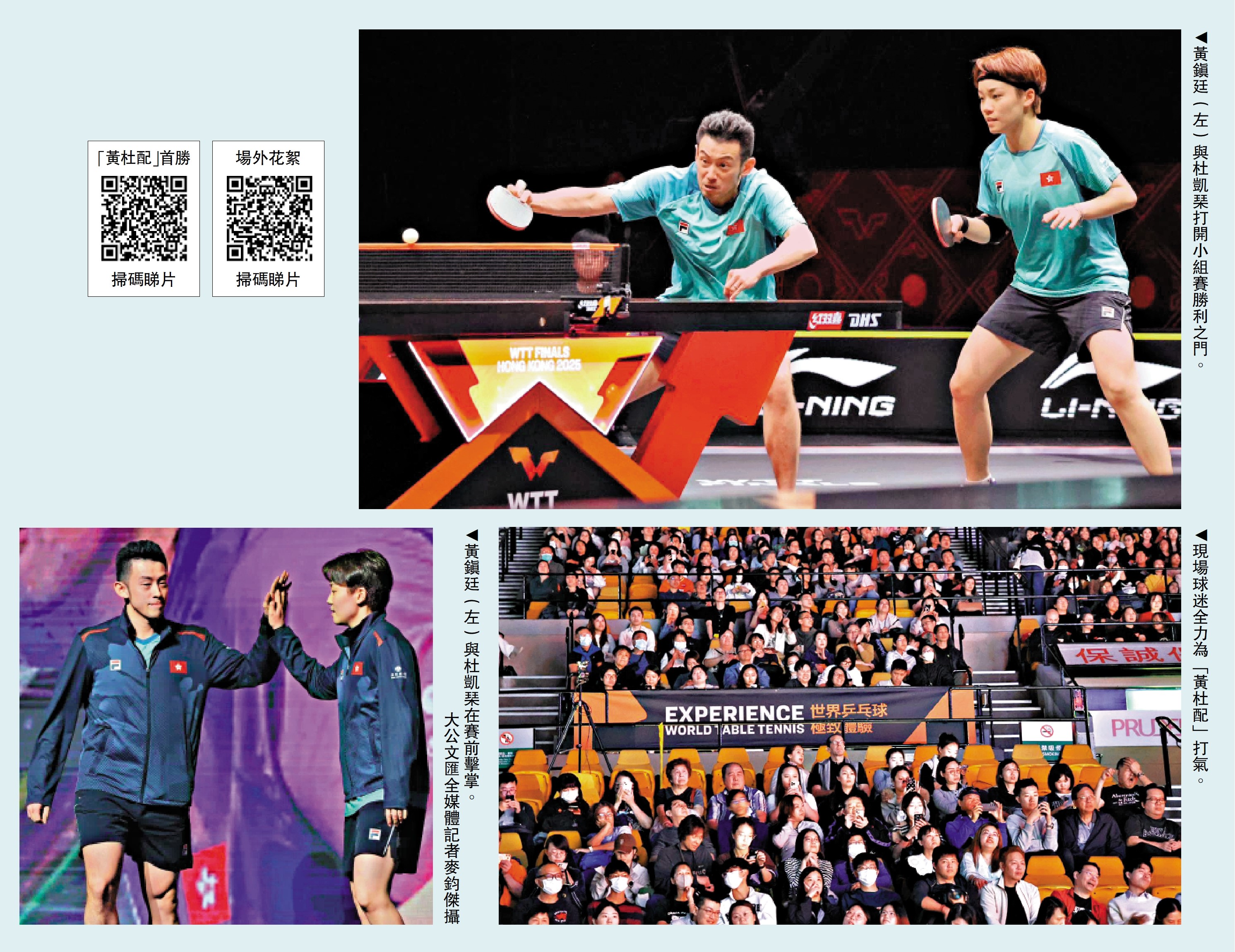 2025年世界乒乓球職業大聯盟(WTT)香港總決賽11日續在香港紅磡體育館舉行,中國香港混合雙打組合「黃杜配」黃鎮廷/杜凱琹在小組賽次輪賽事對陣印度組合馬努什/迪婭。雙方激戰5局,最終「黃杜配」以3:2險勝,保留小組出線4強希望,今晚6時將對陣國家隊組合「莎頭組合」王楚欽/孫穎莎。昨賽後,黃鎮廷表示,在紅館取勝意義重大,感謝現場球迷的全力支持,希望對陣「莎頭組合」時能夠打出自身水準,力爭勝利。\大公報記者 朱家立(文、圖)