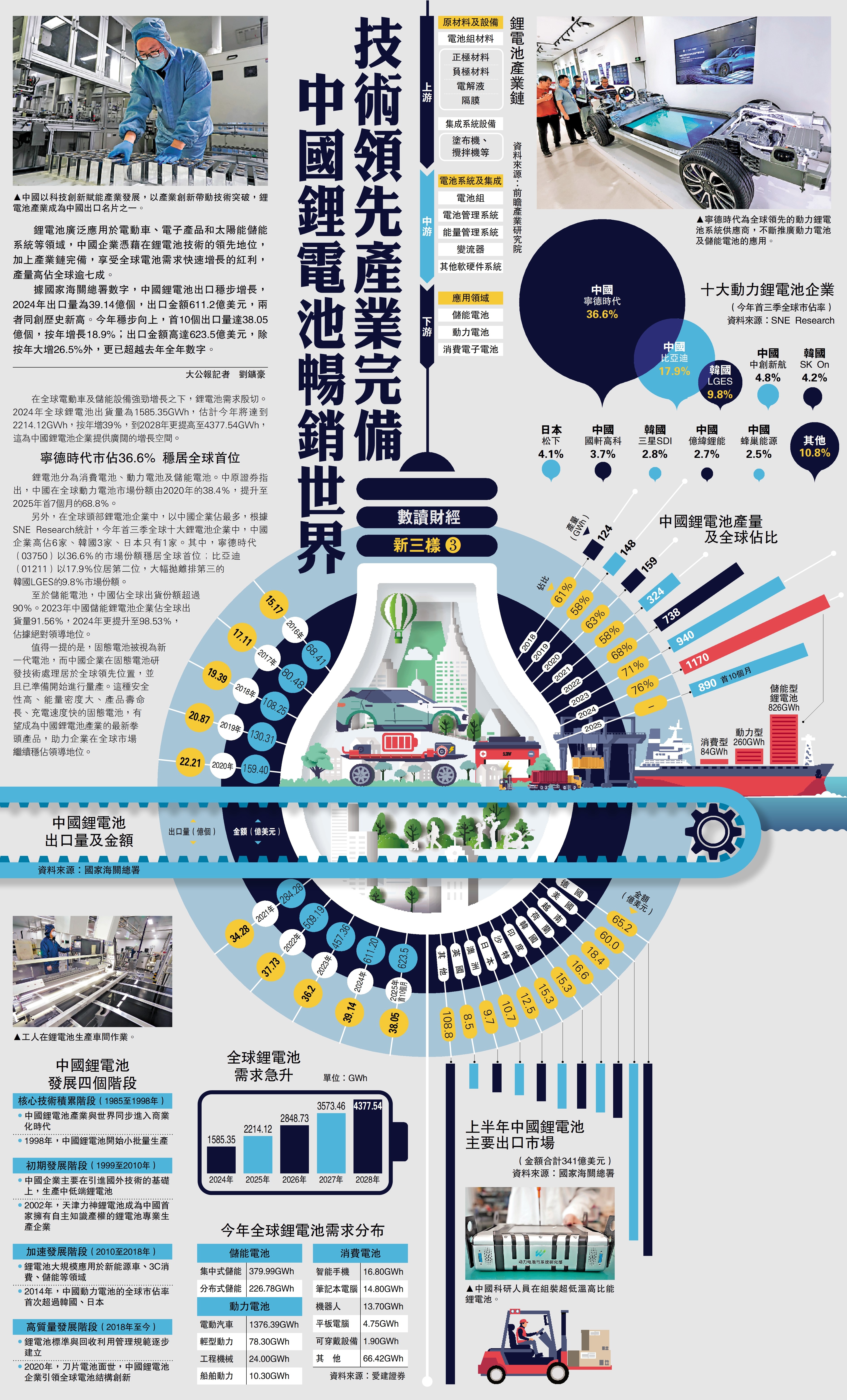 鋰電池廣泛應用於電動車、電子產品和太陽能儲能系統等領域,中國企業憑藉在鋰電池技術的領先地位,加上產業鏈完備,享受全球電池需求快速增長的紅利,產量高佔全球逾七成。