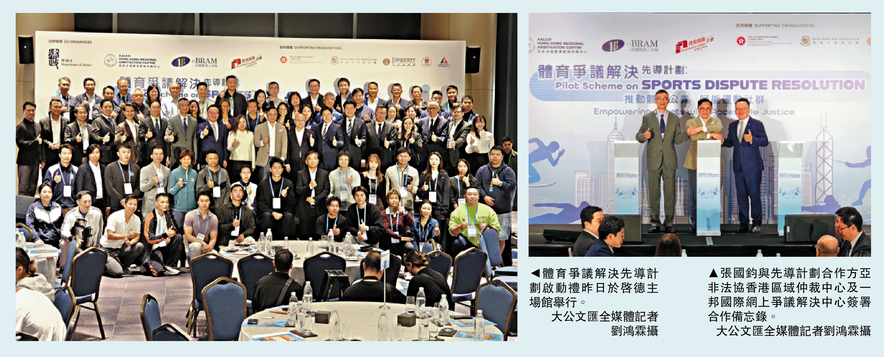 體育爭議解決先導計劃啟動禮昨日於啟德主場館舉行,逾160名來自體育界、法律界的代表參與。先導計劃明年第一季初開始接受案件申請,採用先調解、後仲裁方式解決體育爭議,營辦期為兩年,旨在促進香港體育產業持續發展,並推動本港成為國際體育爭議解決中心。