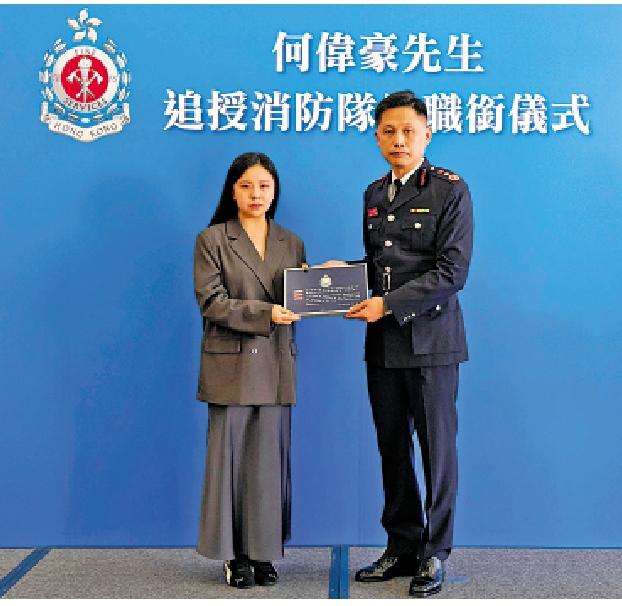 【大公報訊】在大埔宏福苑火災中英勇殉職的消防員何偉豪,昨日獲消防處追授消防隊目榮譽職銜,表揚他在執行滅火救援工作期間堪稱典範的服務和無私精神。