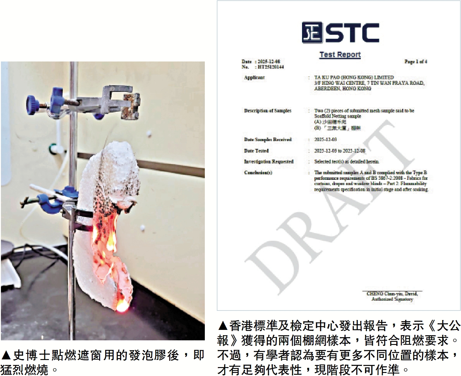 史博士指出,發泡膠高度易燃,將火勢擴大到其他區域,增加撲滅火災的難度,燃燒後更會釋放多種有害化學物質,包括苯乙烯單體(styrene monomer)、苯(benzene)、一氧化碳(carbon monoxide)和多環芳香烴(PAHs)等,火災時產生的有毒煙霧會阻礙視線,並對消防人員和被困人員的生命構成嚴重威脅,並不適合用於大廈外牆維修之用。