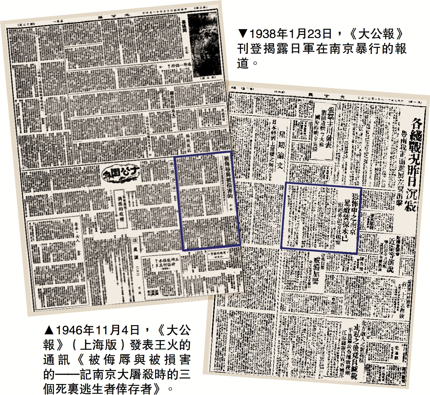 厚厚的採訪筆記本、一大疊珍貴新聞照片,匯成通訊《被侮辱與被損害的——記南京大屠殺時的三個死裏逃生者倖存者》。1946年11月4日,王火以「公亮」為筆名在《大公報》(上海版)上發表此文,迅速轟動一時,讓每一個中國人對南京大屠殺遇難同胞的苦難感同身受。此後,王火又發表《南京大屠殺主犯谷壽夫受審詳記》一文,記錄南京大屠殺罪魁谷壽夫受審伏法的過程,揭示天理昭彰、善惡有報的真理。