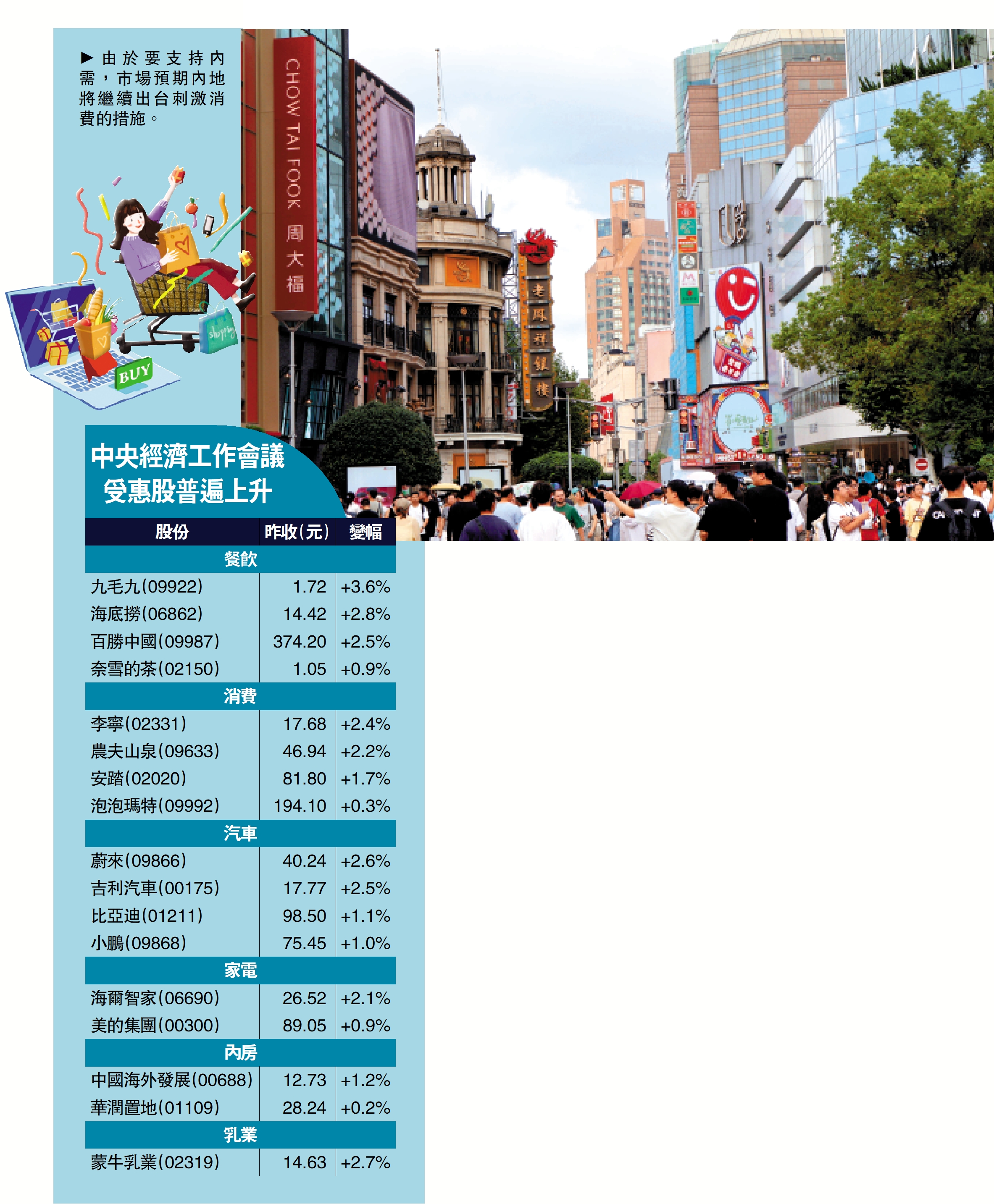 國策提振市場信心,加上外圍市況向好,恒指反彈446點,收報25976點,逼近二萬六關口。中央經濟工作會議將「堅持內需主導」排在首位,餐飲消費板塊獲資金追捧,蒙牛乳業(02319)、海底撈(06862)、百勝中國(09987)、農夫山泉(09633)等升超過2%,多隻車企如吉利(00175)、比亞迪(01211)、小鵬(09868)升1%至2%不等,專家指消費股眾多,宜慎選估值偏低股份。\大公報記者 麥晉瑋