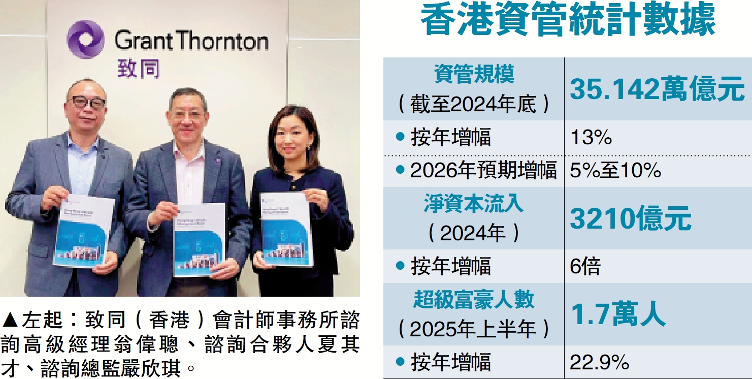 【大公報訊】近年香港資產管理業務持續蓬勃發展,規模不斷擴張。致同會計師事務所發布的報告顯示,截至2024年底,香港財富管理規模已超過35萬億元,按年增長逾一成,預期明年跨境財富管理規模可繼續實現5%至10%的增幅,反映相關服務需求持續旺盛。報告認為,受惠於資本流入及家族辦公室熱潮,香港正加速邁向全球最大跨境財富管理中心的地位,未來有望超越瑞士。