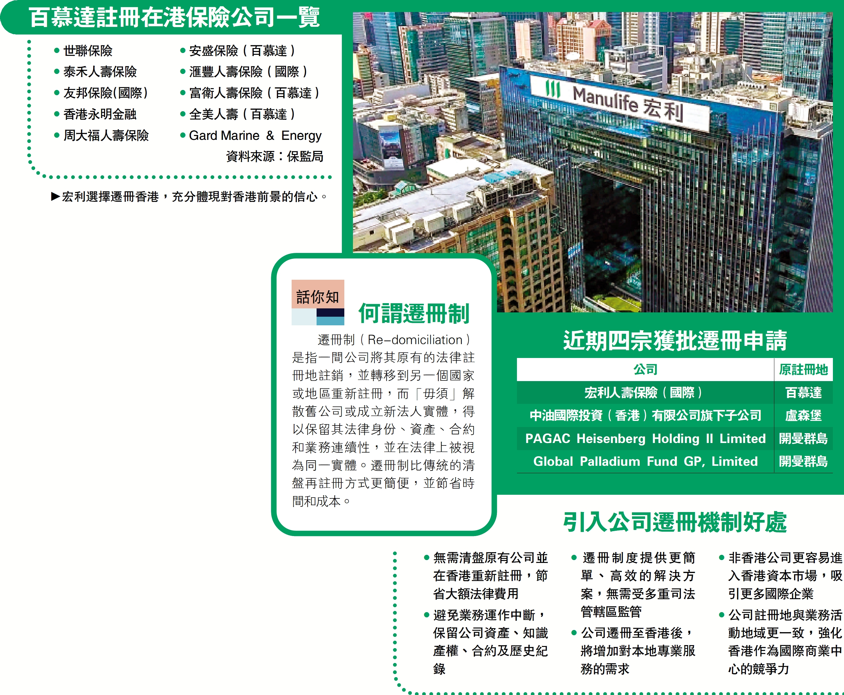 香港公司遷冊制度迎來新突破。宏利人壽保險(國際)昨日宣布,已根據特區政府今年5月底引入的公司遷冊制度,成功將其註冊地由百慕達遷至香港,成為該制度生效以來首家完成遷冊程序的保險公司。此舉不僅標誌着宏利對香港市場的長遠承諾,亦被視為對香港營商環境及國際金融中心地位投下信心一票。\大公報記者 邵淑芬