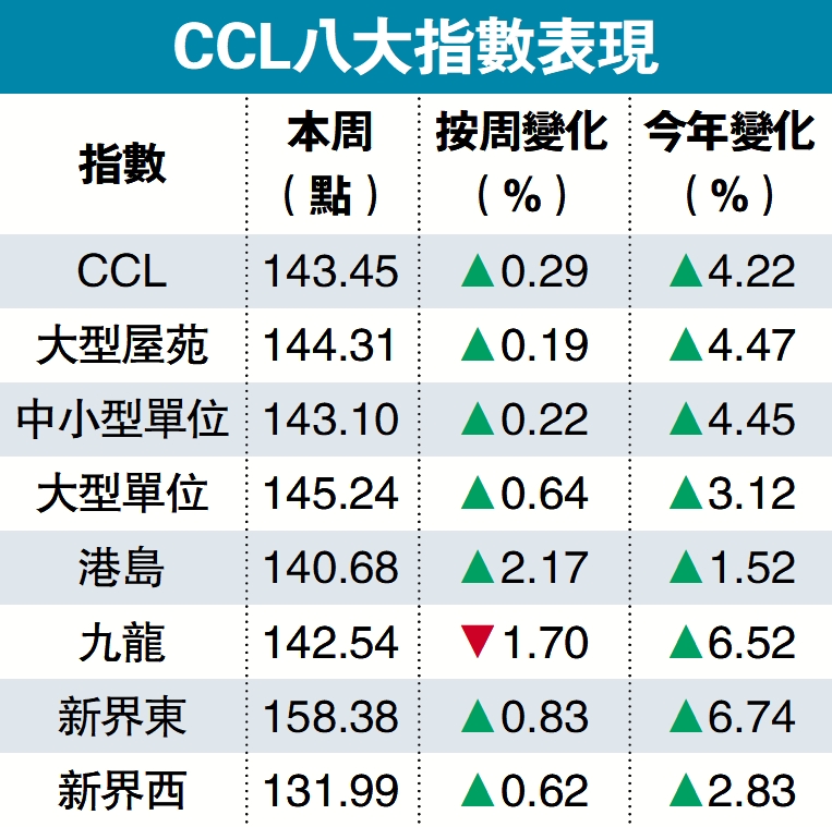 綜觀CCL八大指數,本周以港島二手樓價指數升幅最大,報140.68點,按周升2.17%,結束2周連跌,惟今年計只升1.52%,為八大指數中最落後。