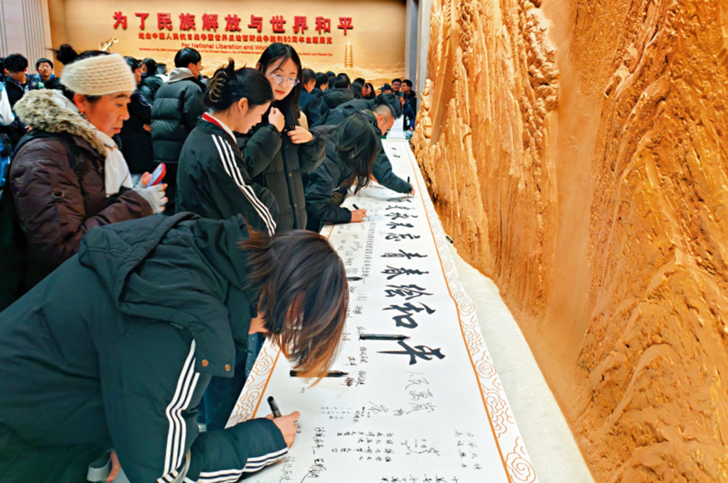 學生代表們向南京大屠殺死難者獻花,然後在「歷史永不忘 青春繪和平」長卷上留言簽名,而「歷史」「和平」等成為長卷上的熱門詞。來自北京石油化工學院的學生們還將親手製作的千紙鶴放置到「1213」容器中,以此紀念南京大屠殺中的死難同胞們。\大公報記者馬曉芳