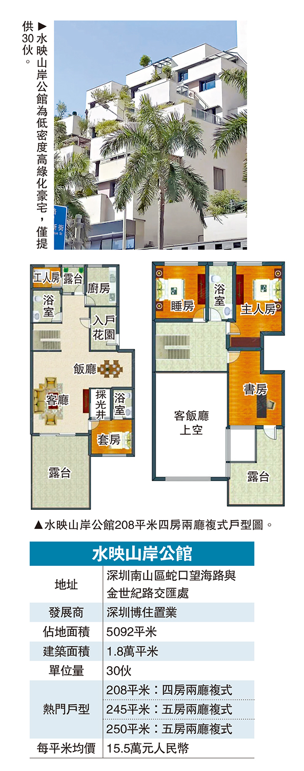作為高端改善的全系產品,項目主力聚焦複式戶型,總價逾3000萬元(人民幣,下同)起。其中245平米複式疊墅,五房兩廳設計,中空客廳配私家花園;250平米山海流水複式別墅,客廳樓底高達6.8米,帶有150平米露台。項目二手放盤每平米均價約15.5萬元,高於蛇口片區均價10.3萬元。租金方面,245平米複式疊墅月租約4.2萬元,投資回報率穩定。