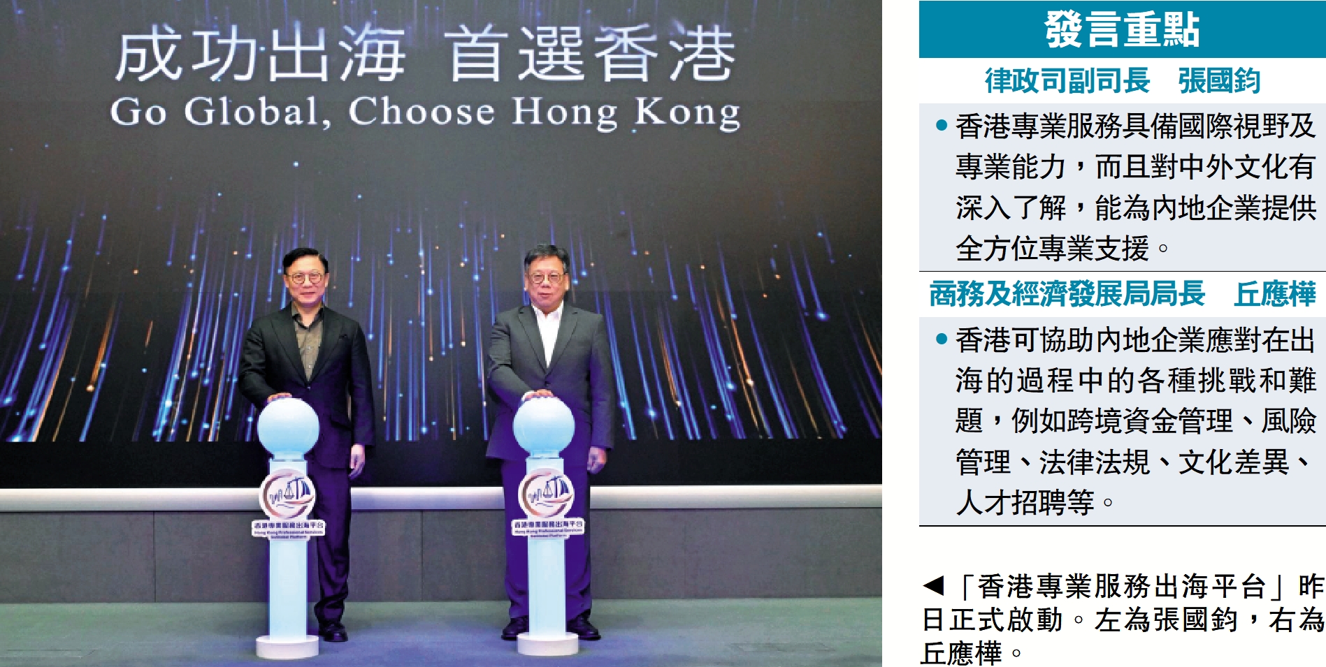 由律政司推動發起、商務及經濟發展局支持的「香港專業服務出海平台」昨日(13日)正式啟動,標誌香港專業服務協同支援內地企業出海邁向新階段。平台由律政司副司長張國鈞督導設立,以落實施政報告明確提出,要強化香港作為企業出海平台的優勢,並指明由律政司副司長專責推廣香港法律服務,協同其他專業如會計、金融等,支援內企出海需要。/大公報記者 李信