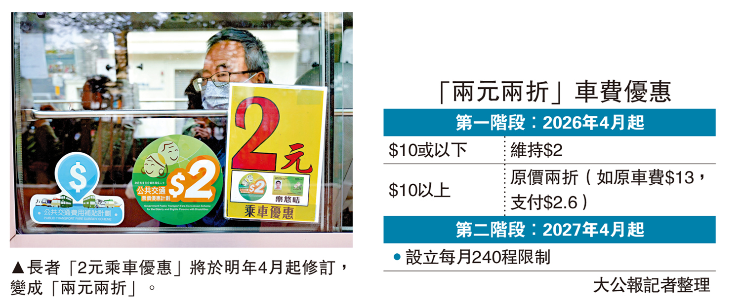 【大公報訊】記者戴東報道:為更好地運用公共開支,以及改善「長車短搭」情況,財政預算案公布將長者「2元乘車優惠」,改為「兩元兩折」,新規定將於明年4月生效,屆時票價低於或等於十元的車程,維持繳付兩元車費,至於票價高於十元則繳付全額車費的兩折;自2027年4月起,每月可享受優惠的車程以240程為限。