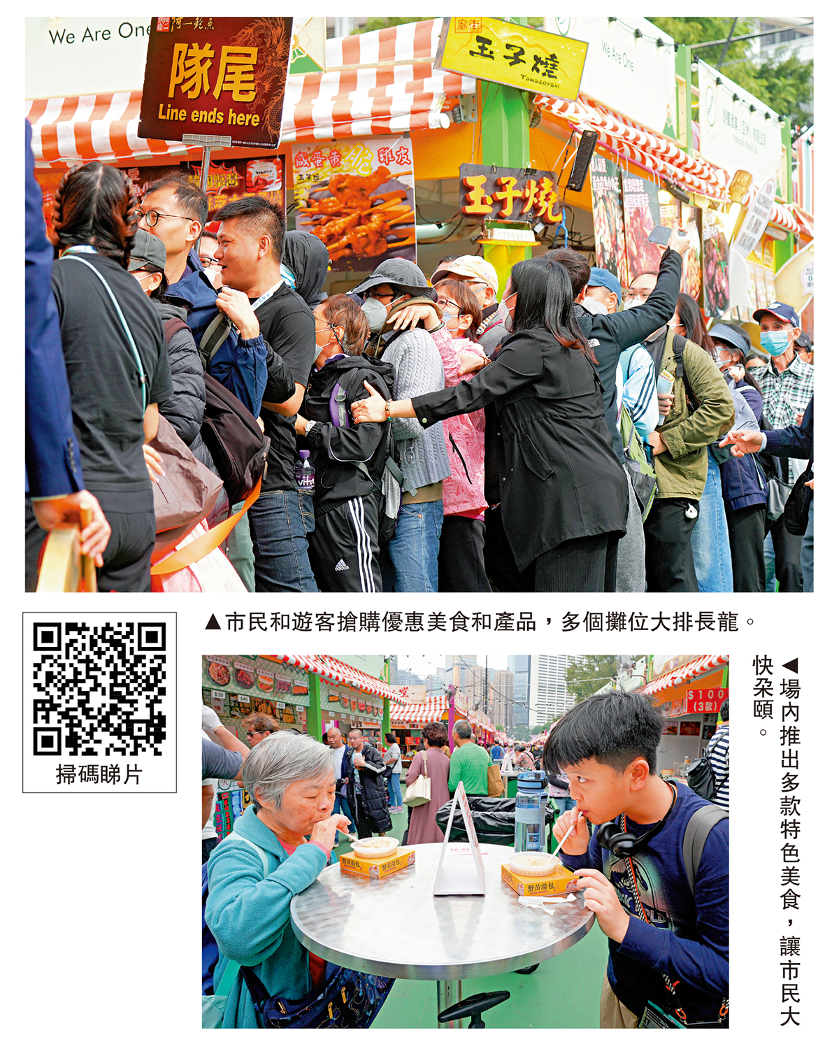 大公報記者在會場直擊,從早上至下午一直擠滿人潮,在各個攤位之間穿梭亦顯得頗為困難。有市民拿着大包細包的貨品,亦有人拉着塞滿貨品的購物車。下午4時許雖然下了小雨,人潮和熱鬧的氛圍也沒有減少。場內除了本地市民,亦見到有不少海外遊客前來品嘗不同美食及購物。