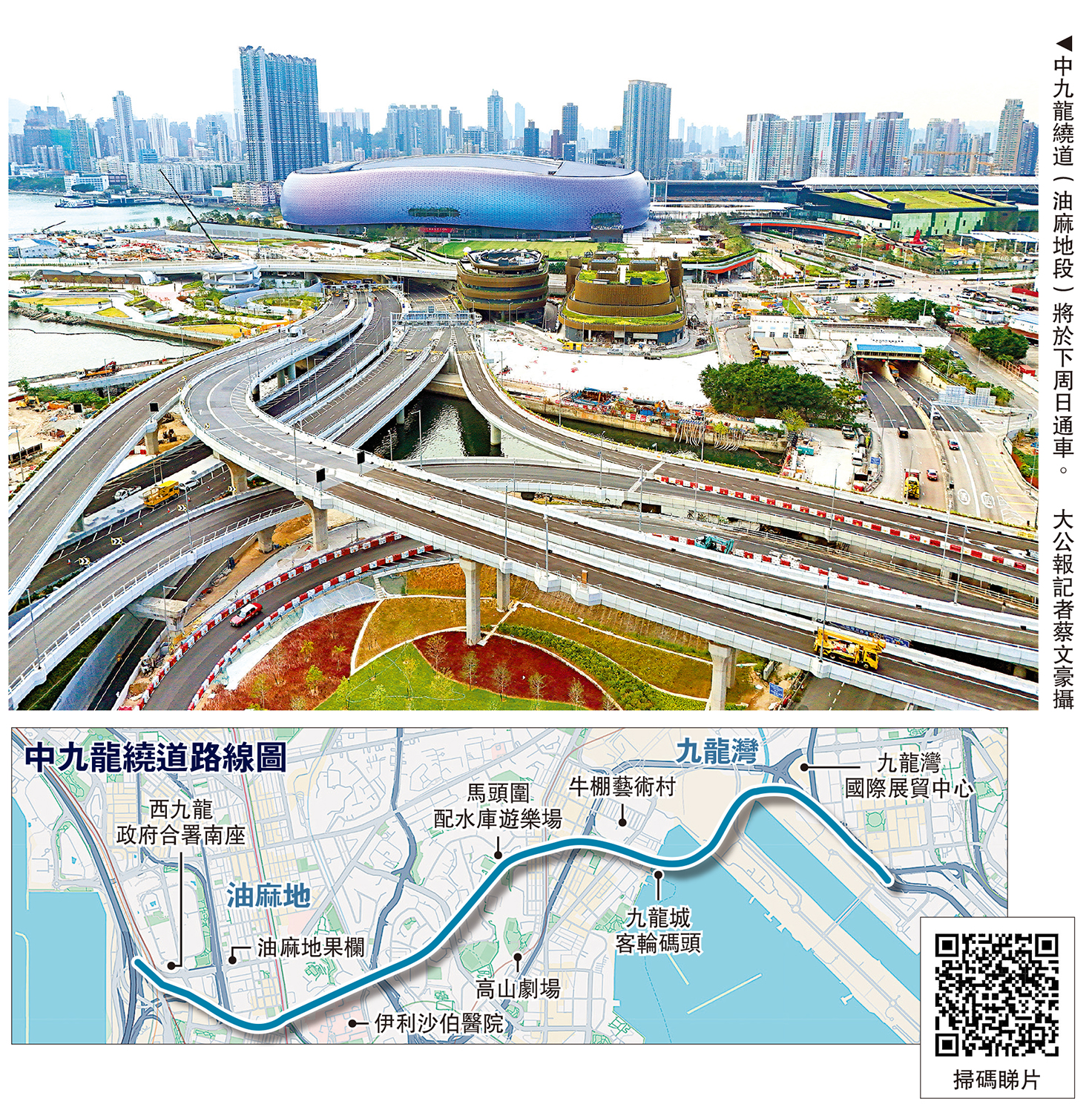 中九龍繞道(油麻地段)將於下星期日(21日)通車,貫通連接西九龍的油麻地至東九龍的啟德和九龍灣一帶,繁忙時間車程可由30分鐘大大縮短至僅約5分鐘。