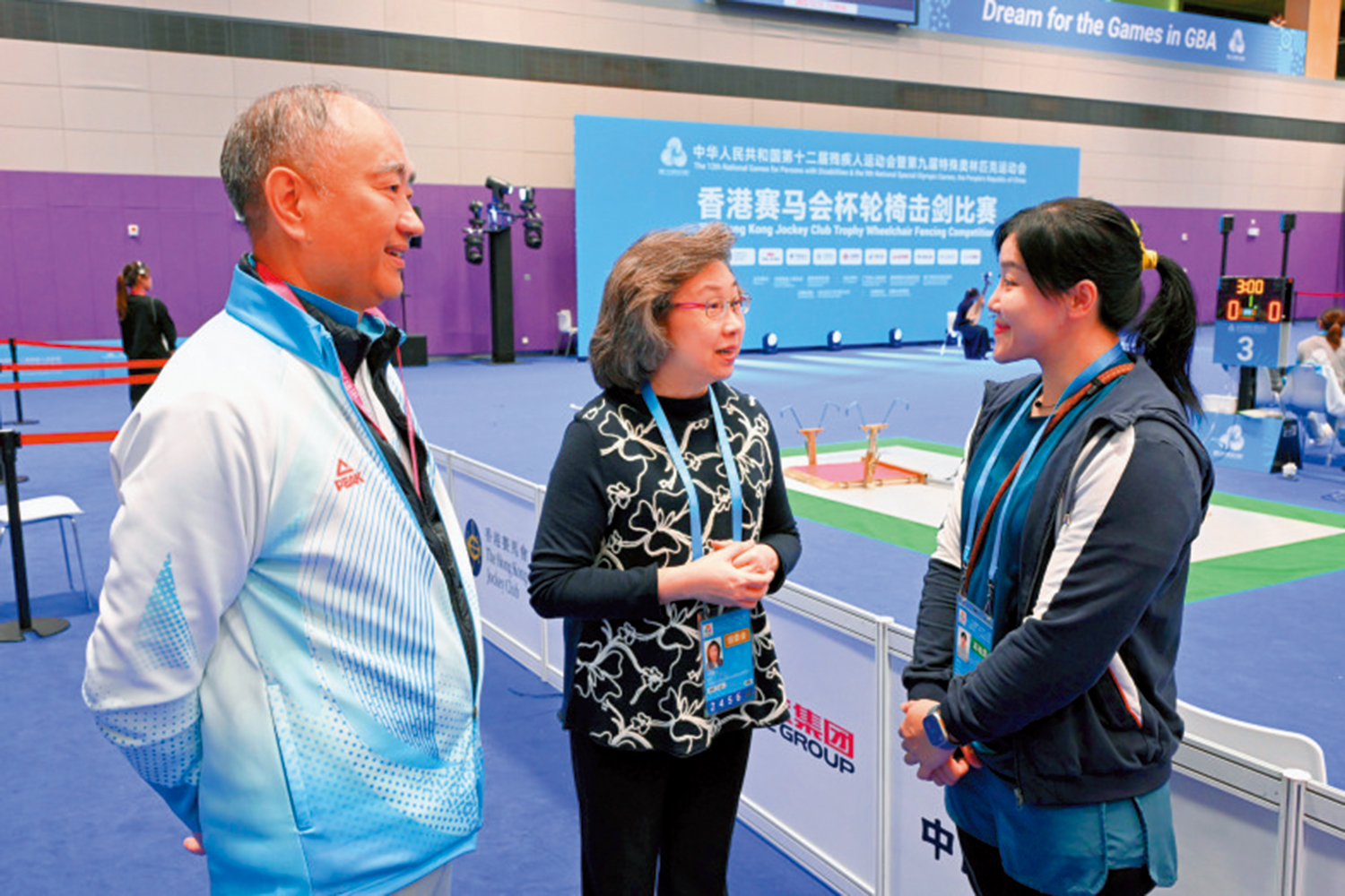 【大公報訊】殘特奧會已到尾聲,13日早上,公務員事務局局長楊何蓓茵(中)到馬鞍山體育館觀看輪椅劍擊的多場比賽,包括女子個人佩劍A級、男子個人重劍B級的四強和金牌戰。楊何蓓茵在中國香港傷殘人士體育協會總幹事吳曙明(左)陪同下,與港隊輪椅劍擊運動員余翠怡(右)傾談,隨後再到熱身區為輪椅劍擊隊運動員及教練團打氣。