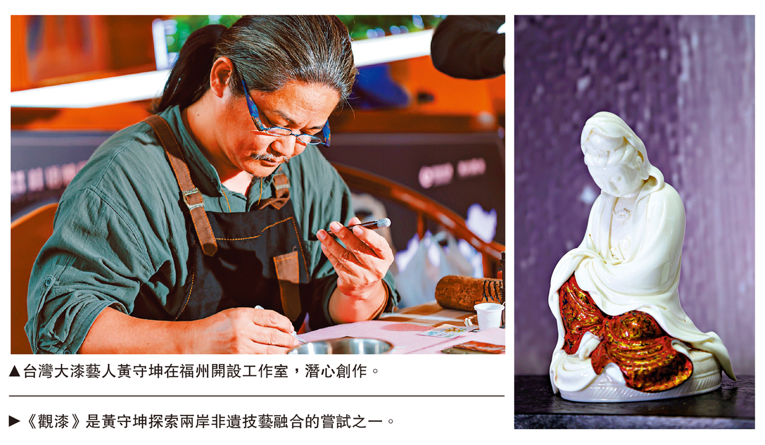 作為漆器生產重鎮,福州一直擁有從大漆原料加工到大漆傳承與工藝製作完整的產業生態,與台灣地區僅僅一水之隔,交通方便。2016年,黃守坤首次赴福州參加兩岸創作人市集,發現此間「漆藝的種量、材料、技法底蘊比台灣多太多了」,而且還有相關惠台政策,黃守坤隔年便毅然赴福州發展,創立自己的工作室。其間,他一直在尋找融合兩岸元素的漆藝創作方式和文創落地模式。如今,在羅源縣下湖村,黃守坤找尋到了方向,他一邊進行藝術創作,一邊開展鄉建鄉創,用藝術裝點心中的桃花源,豐富文旅內容,助力下湖村鄉村振興。