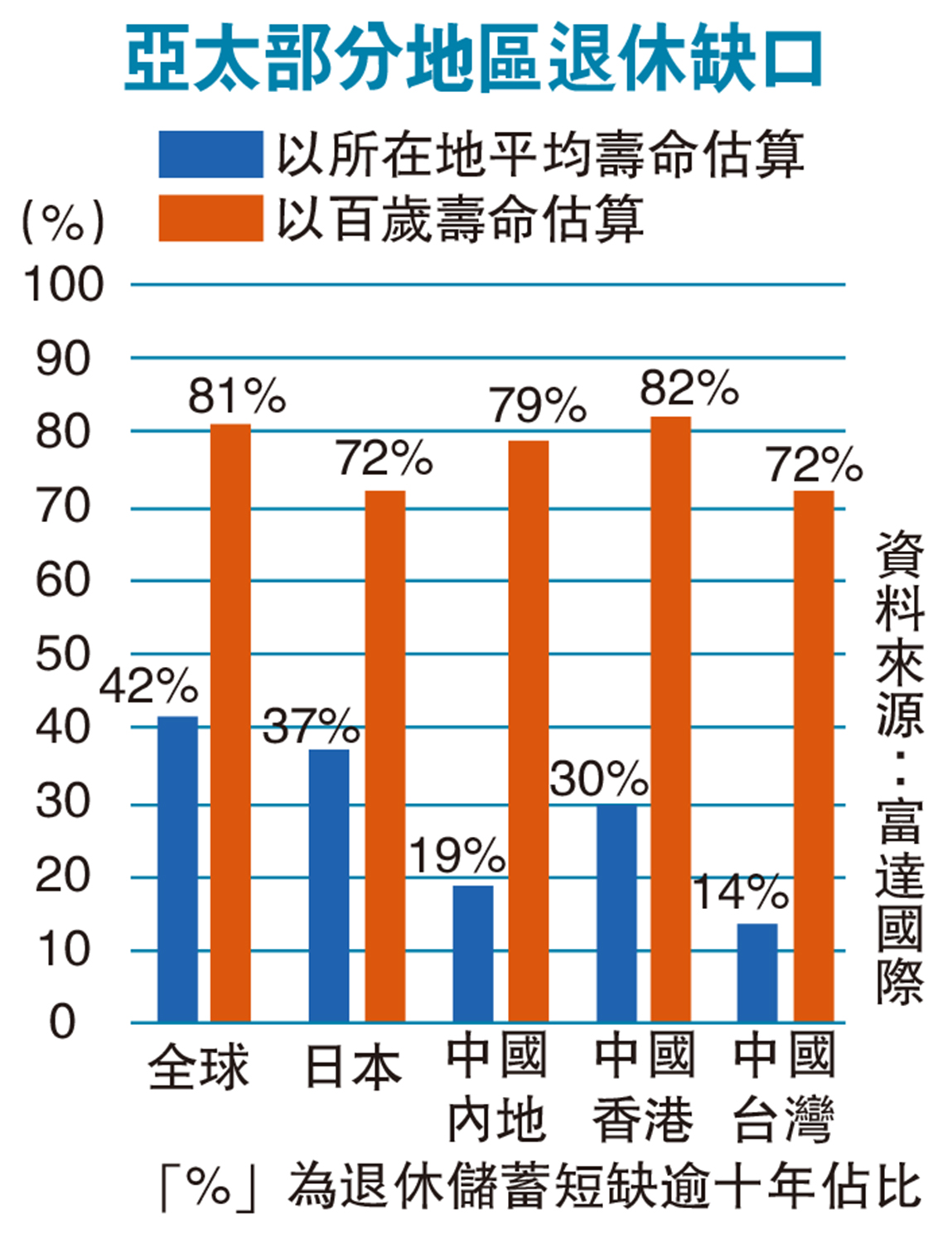 富達國際與英國國家高齡創新中心(NICA)合作的研究顯示,全球年滿50歲人士中,每五位便有兩位(42%)面臨至少10年的退休儲蓄缺口,若以百歲人生為基礎,比例更高達八成(81%)。亞太地區中香港與日本擁有全球最高平均壽命,惟這些地區分別有82%及72%受訪者面對逾10年退休儲蓄缺口,尤其值得關注。