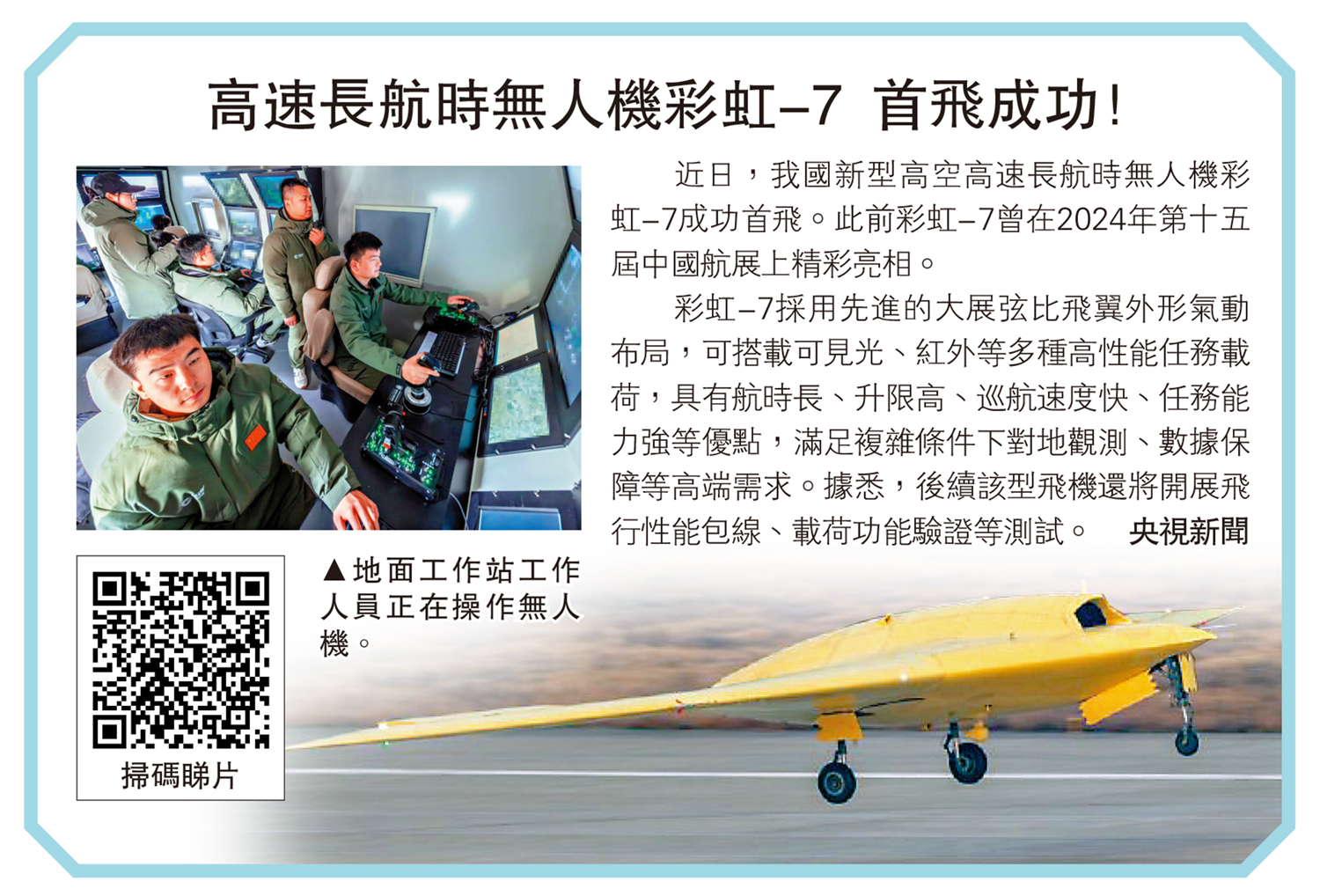 彩虹-7採用先進的大展弦比飛翼外形氣動布局,可搭載可見光、紅外等多種高性能任務載荷,具有航時長、升限高、巡航速度快、任務能力強等優點,滿足複雜條件下對地觀測、數據保障等高端需求。據悉,後續該型飛機還將開展飛行性能包線、載荷功能驗證等測試。\央視新聞