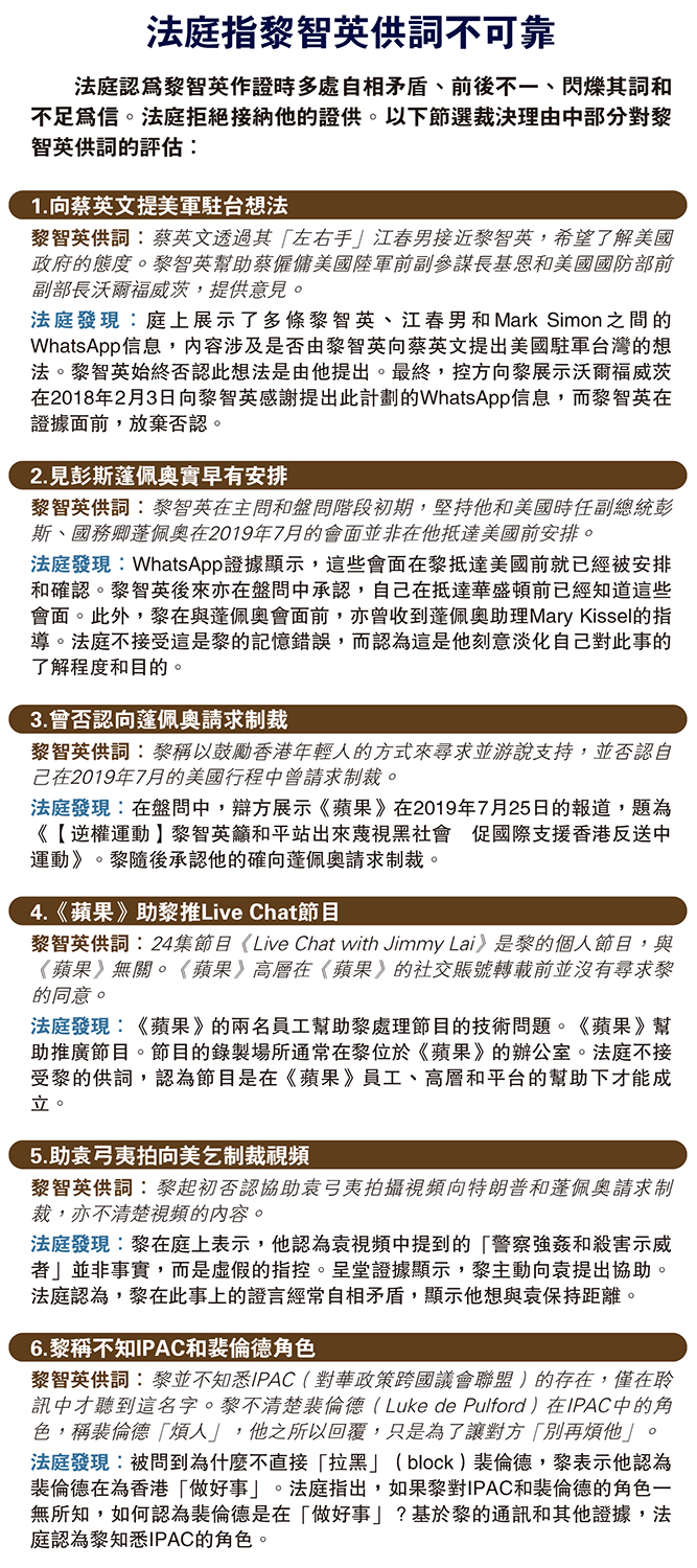 法庭認為黎智英作證時多處自相矛盾、前後不一、閃爍其詞和不足為信。法庭拒絕接納他的證供。以下節選裁決理由中部分對黎智英供詞的評估: