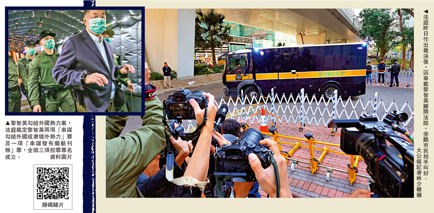 高等法院原訟法庭昨日就黎智英及《蘋果日報》相關三間公司被控共三項危害國家安全罪行的案件作出裁決。黎智英和三間被告公司全部控罪罪名成立。