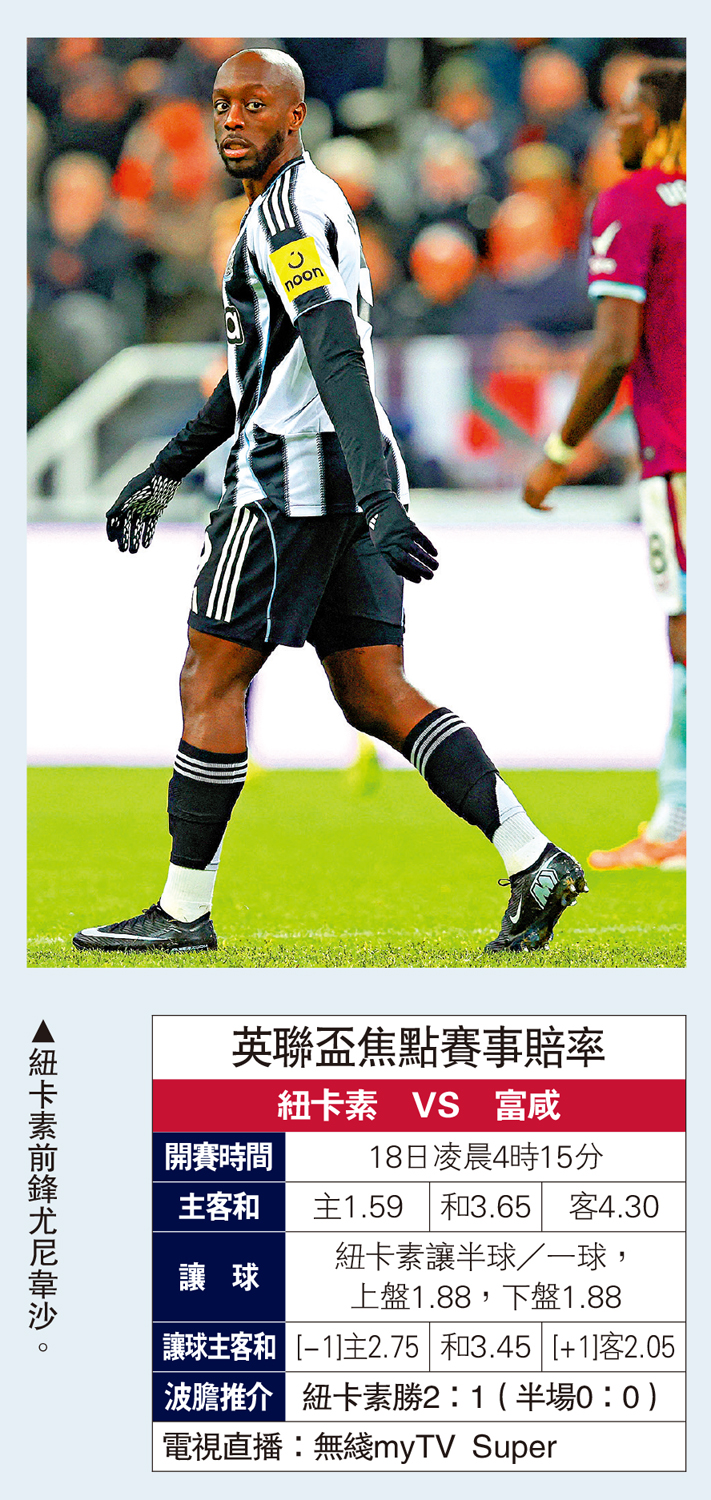 【大公報訊】明晨另一場英格蘭聯賽盃8強戰,由上屆冠軍紐卡素主場迎擊富咸。紐卡素固然希望成功衛冕,而他們也未受非洲盃影響,相反富咸就有3名主力暫別,預料主隊即使作出若干輪換仍力足小勝晉級,可敲「讓球主客和」紐卡素[-1]的讓和。(無綫myTV Super明晨4時15分直播)