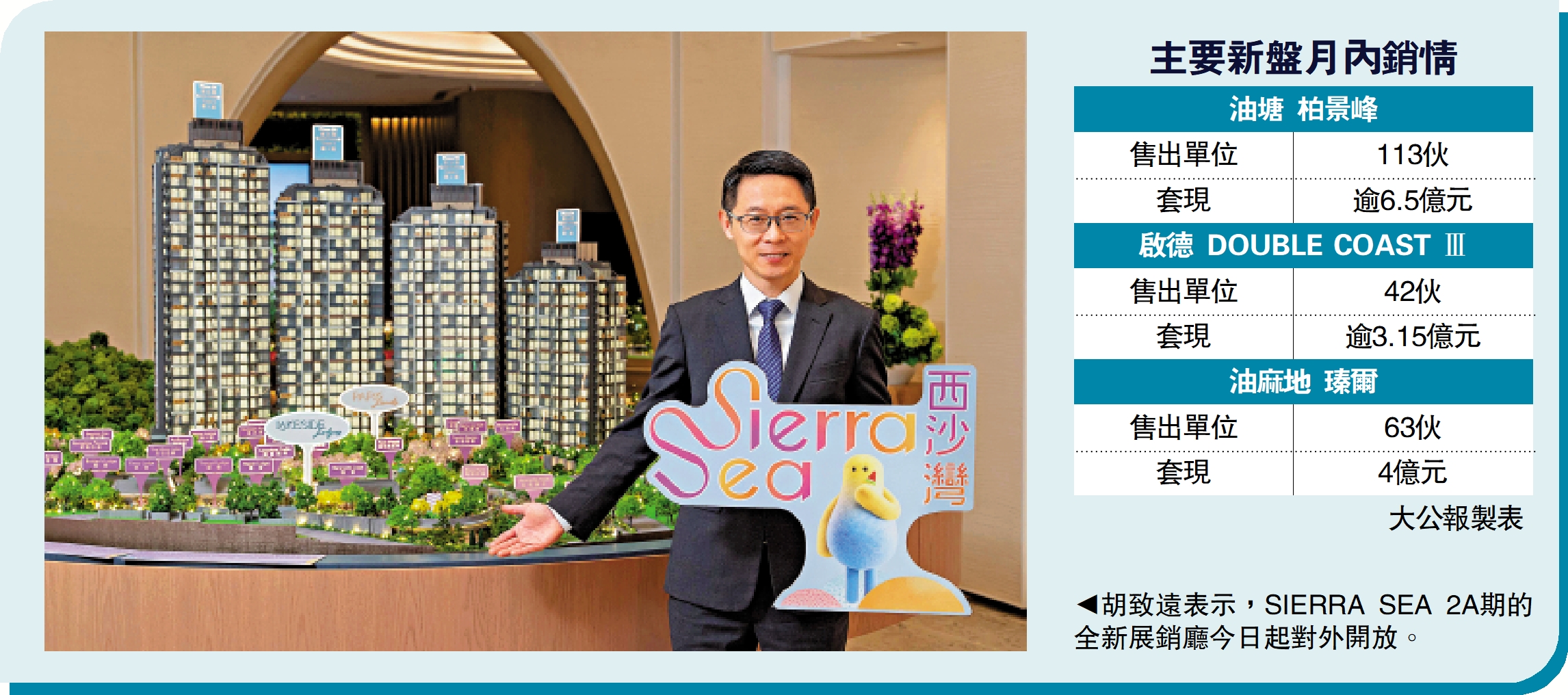 其他新盤方面,SIERRA SEA 2A期蓄勢待發。新地代理總經理胡致遠表示,項目位於西沙GO Park的全新展銷廳今日起對外開放,展銷廳面積1萬方呎,將展示全新2A期及整體規劃模型、全新項目規劃圖及會所介紹短片。預計最快下周上載樓書。