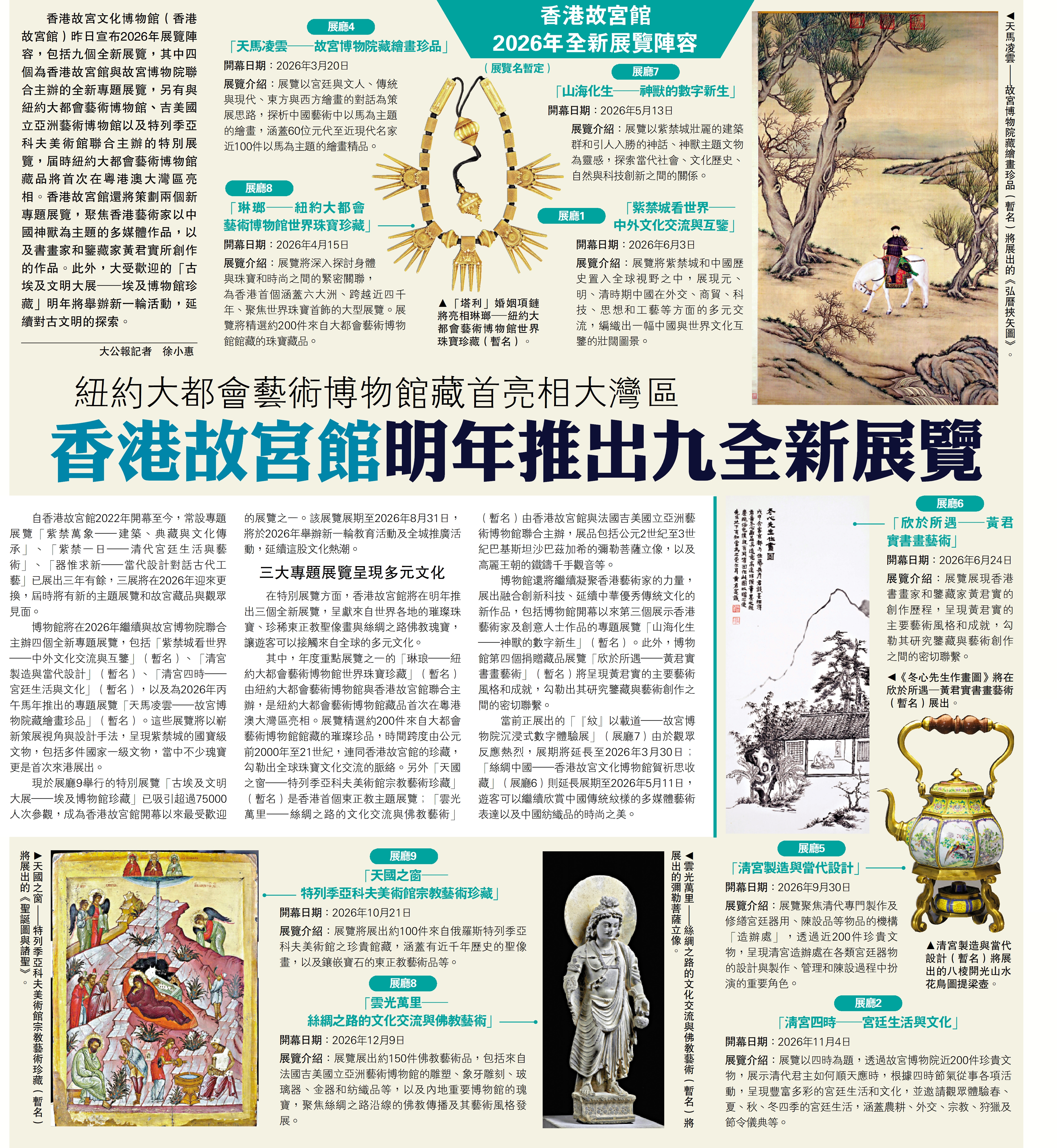 香港故宮文化博物館(香港故宮館)昨日宣布2026年展覽陣容,包括九個全新展覽,其中四個為香港故宮館與故宮博物院聯合主辦的全新專題展覽,另有與紐約大都會藝術博物館、吉美國立亞洲藝術博物館以及特列季亞科夫美術館聯合主辦的特別展覽,届時紐約大都會藝術博物館藏品將首次在粵港澳大灣區亮相。香港故宮館還將策劃兩個新專題展覽,聚焦香港藝術家以中國神獸為主題的多媒體作品,以及書畫家和鑒藏家黃君實所創作的作品。此外,大受歡迎的「古埃及文明大展─埃及博物館珍藏」明年將舉辦新一輪活動,延續對古文明的探索。\大公報記者 徐小惠
